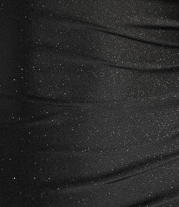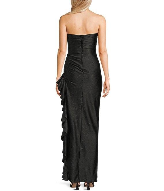 From Honey and Rosie, this dress features: Glitter satin fabric Strapless neckline Shirred sides Side slit with cascading ruffles Zip back closure Approx. 56 3/4" length Polyester/spandex; partially lined Hand wash; dry flat Imported.