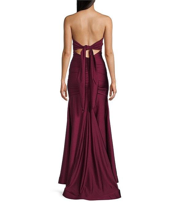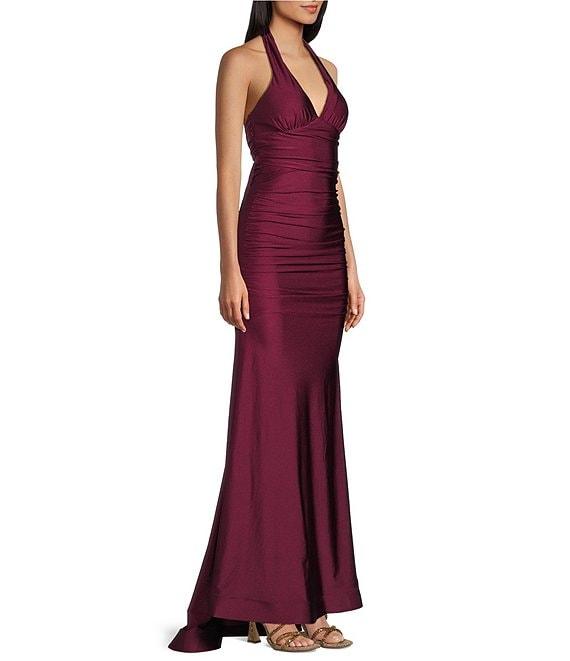 From Honey and Rosie, this grown features: V-neck Sleeveless Two buttons at center back neck Open back tie/zipper closure Wide cummerbund front waistband Shirring down front skirt A-line Nylon tricot knit 59 1/2" length Nylon/spandex Hand wash/lay flat to dry Imported.