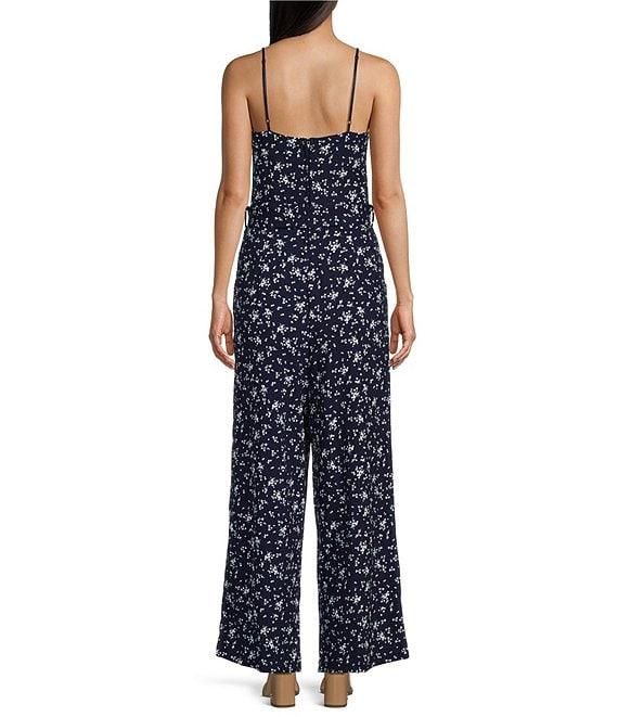 From Honey and Rosie, this jumpsuit features: Sweetheart neckline Adjustable spaghetti straps Front hip pockets Self-tie belt Lined bodice Zip at center back Allover print Approx. 32" inseam. out seam 34" Polyester/spandex Machine wash/line dry Imported.