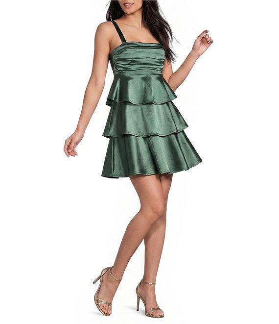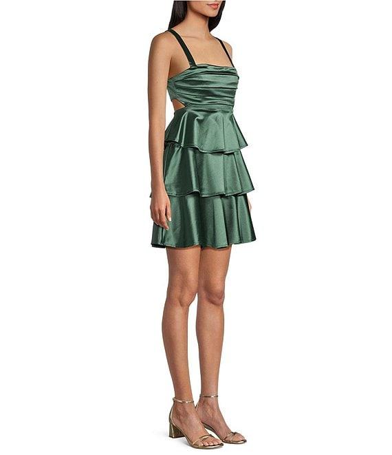 Honey and Rosie Sateen Square Neck Pleated Bodice Back Cut-Out Tiered Dress