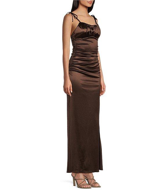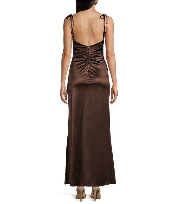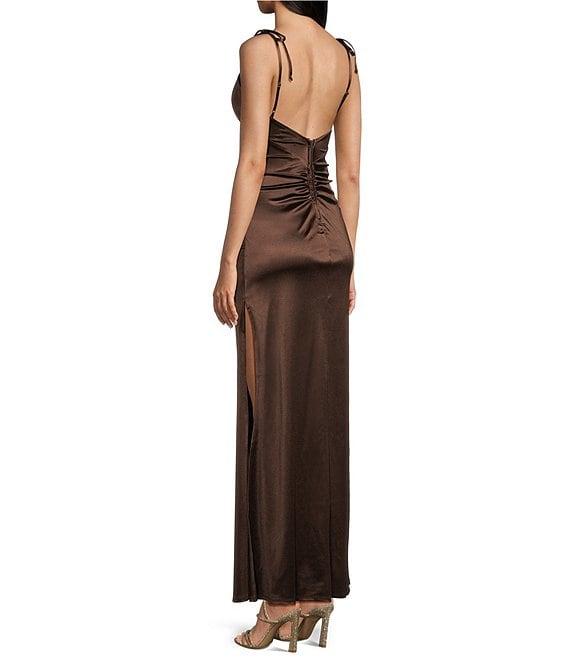 From Honey and Rosie, this grown features: Royal sateen fabric Scoop neck Sleeveless Spaghetti-tacked tie straps Low V-shaped back Skit at wearer's left lower skirt Zipper back closure 56 1/4" inseam Polyester/spandex Machine wash/dry flat Imported.