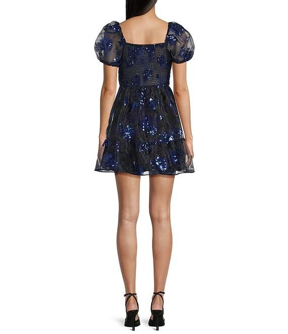 Honey and Rosie Sequin Embellished Organza V-Neck Puff Sleeve Fit And Flare Dress