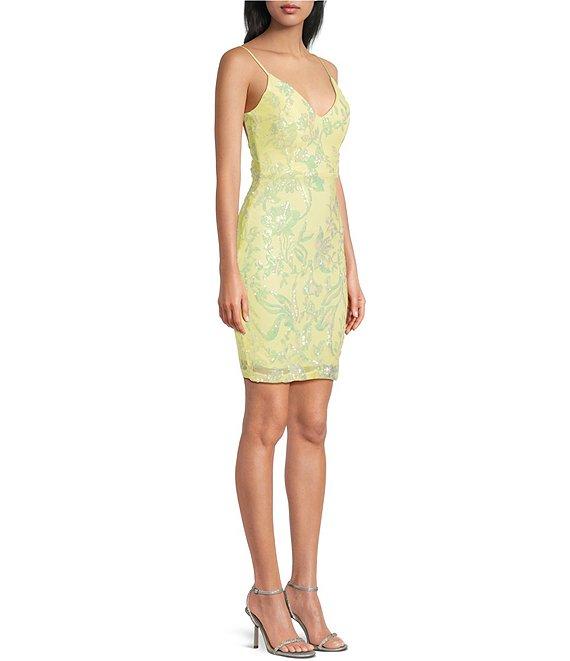 From Honey and Rosie, this dress features: Sequin patterned fabric V-neckline Adjustable spaghetti straps Bra cups Lace up back and zip closure 31 1/2" length Polyester/spandex Hand wash or dry clean Imported.