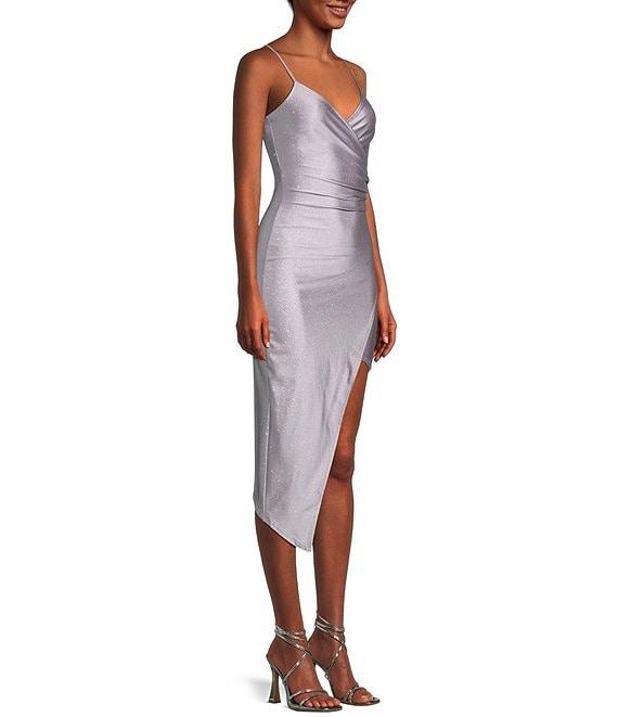 From Honey and Rosie, this dress features: Shimmer glitter stretch satin fabrication Surplice v-neckline Adjustable spaghetti straps Pullover styling Ruched side Lined Faux-wrap silhouette Asymmetric hem Approx. 28" in length Polyester/spandex Hand wash Imported.