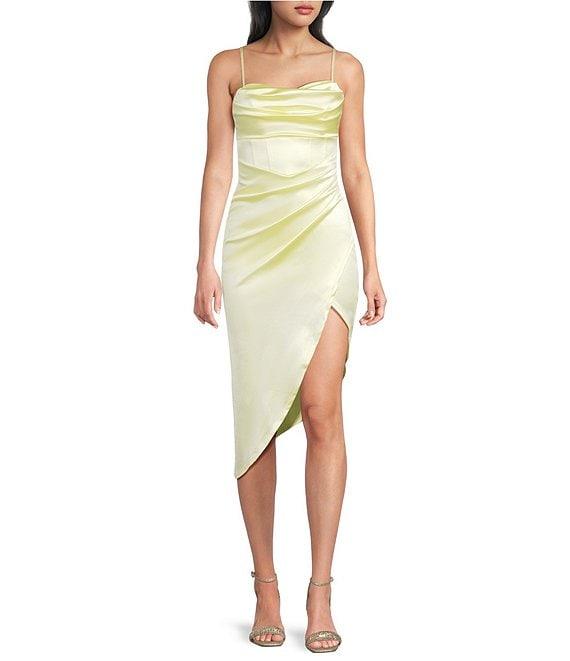 From Honey and Rosie, this dress features: Cowl neckSweetheart necklineSleevelessAdjustable spaghetti strapsBra cupPleating at wearer's front left waistAsymmetrical hemElastic in back necklineZipper at center backLined-bodice only dark colors-fully lined ivory colorApprox. 33 1/4" center backHand wash/line dryImported.