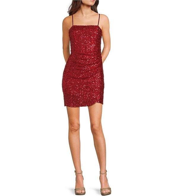 From Honey and Rosie, this dress features: Allover sequins Square neck Adjustable spaghetti straps Pleating at front left hip Elastic back neckline Empire seam Zipper at center back Lined in bodice only Approx. 28" Polyester Dry clean Imported.
