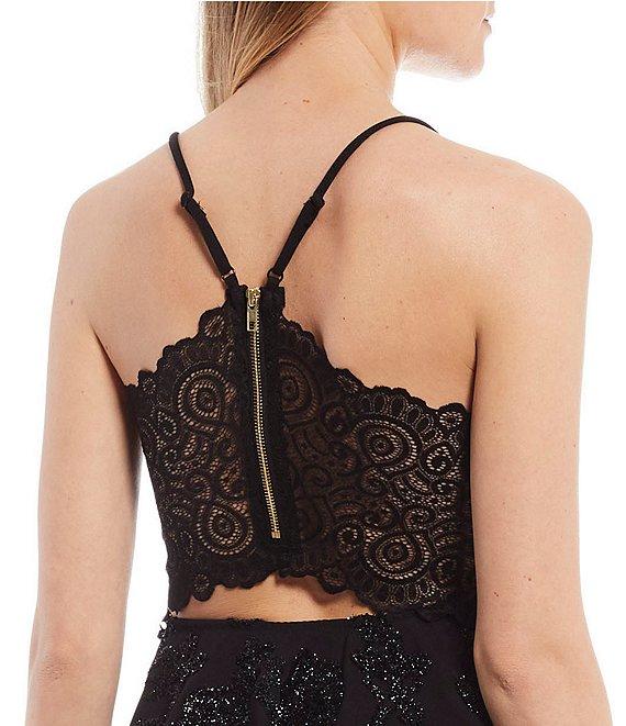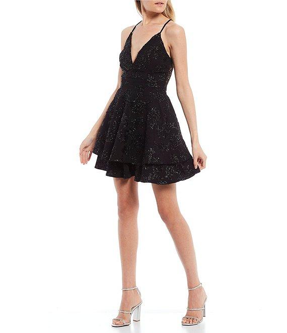From Honey and Rosie, this dress features: Eyelash patterned fabric Deep V-neckline Adjustable spaghetti straps Zip-back closure Illusion lace bra back with exposed zip Double hem Fit and flare silhouette Approx. 29 1/2" length Polyester/Spandex Hand wash Imported.