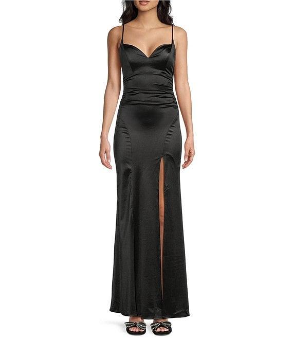 From Honey and Rosie, this dress features: Deep V-neck Sleeveless Extra thick bra cups for added shape and support Shirred at side waist Royal sateen fabric Lined to mid-thigh Zipper at center back Slit at front left skirt Princess seams front and back Lined Approx. 56" Polyester/spandex Hand wash/lay flat to dry Imported.