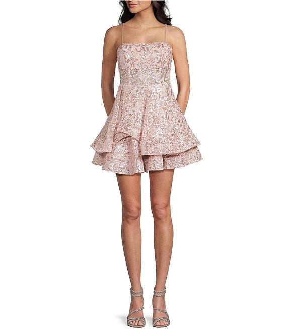 From Honey and Rosie, this dress features: Allover cored embroidery lase mesh Square neck Sleeveless Adjustable spaghetti straps Spaghetti lace back closure Double-layer skirt Horsehair in hems Wide waistband for a flattering fit Fully lined Approx. 23" Hand wash/line dry Imported.