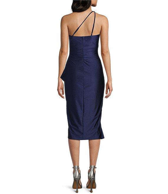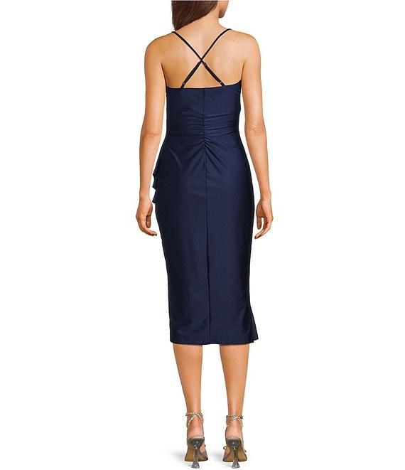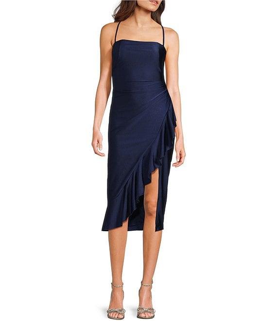 Honey and Rosie Straight Neck Criss Cross Back Asymmetrical Ruffled Midi Dress
