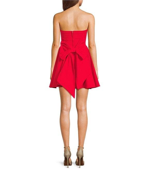 From Honey and Rosie, this dress features: Strapless neckline Bra cups Bow back Fit and flare skirt Zip back closure 27" length Rayon/nylon/spandex; lined bodice Machine wash/tumble dry Imported.