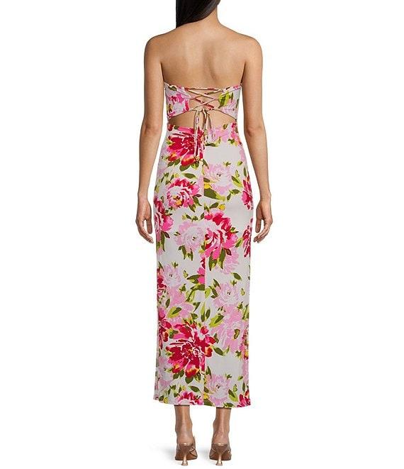 From Honey and Rosie, this dress features: All-over floral print Strapless Sleeveless Lace-up back Midi Shirred throughout 48 1/2" length Polyester/spandex Machine wash/tumble dry Imported.