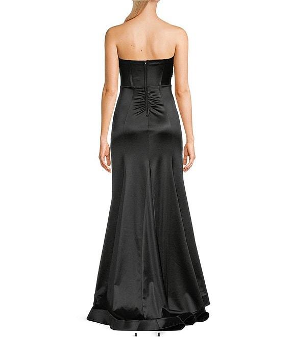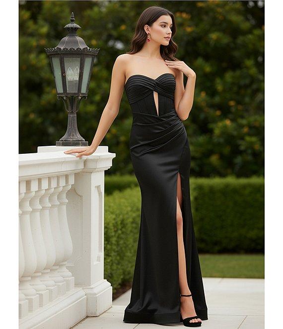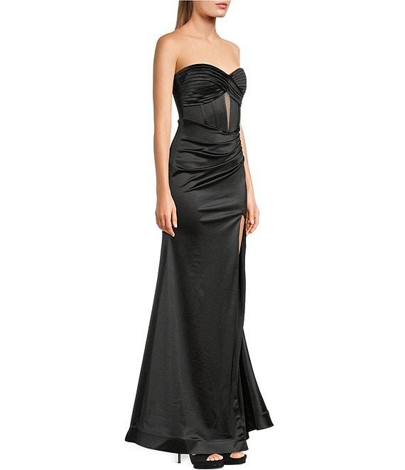 Honey and Rosie Strapless Twist Front Illusion Corseted Side Slit Dress