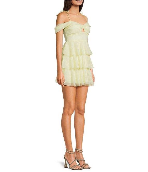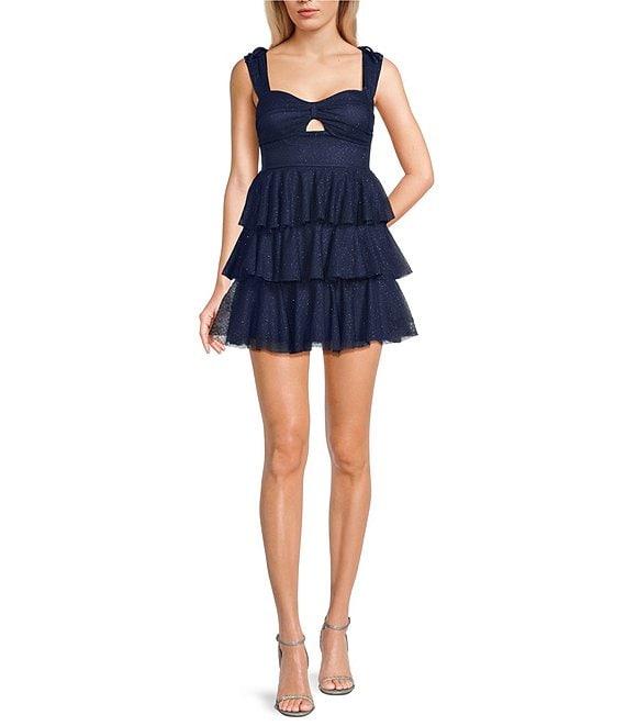 From Honey and Rosie this dress features: Metallic nylon meshSweetheart necklineSleevelessAdjustable spaghetti strapsBow at top of the shoulderShirred bodice with a small keyholeThree ruffle skirtZipper at center backLinedApprox. 26"Polyester/spandexHand wash/line dryImported.