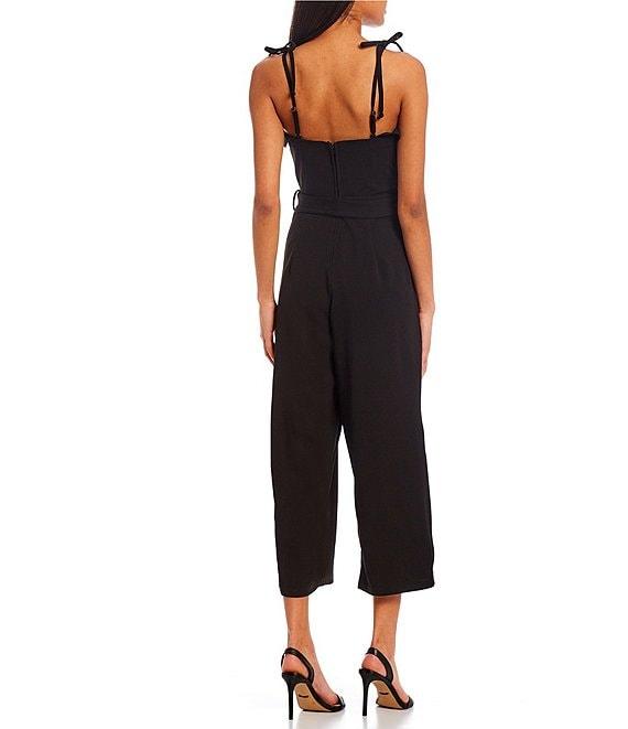 From Honey and Rosie, this jumpsuit featuresCrepe fabricationsquare neckline with ruffle popover detailTie spaghetti strapsIllusion bodicebelt loopsSide pocketsTie sash at the waistWide legsCropped hemlinepartial zip back closureApprox. 23" inseamPolyester/spandexHand washImported.