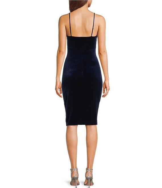 From Honey and Rosie, this dress features: Stretch velvet V-neck Sleeveless Adjustable spaghetti straps Pleating at wearer's left front waist Small front skirt opening Elastic in back neckline Approx. 36 1/4" Polyester/spandex Machine wash/line dry Imported.