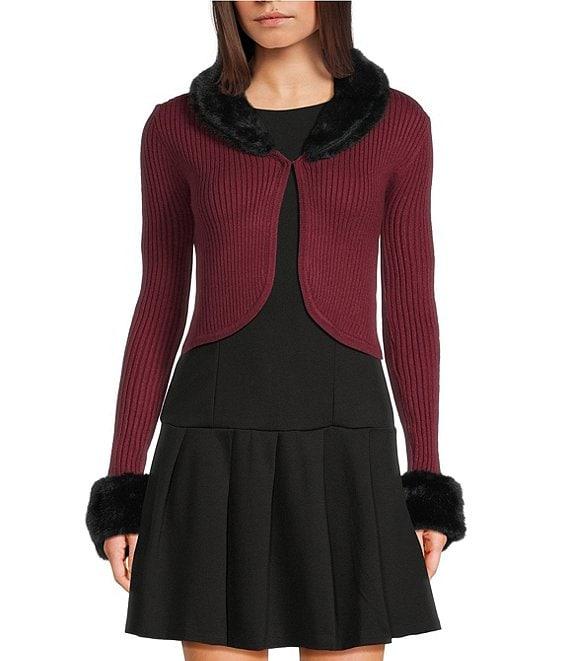 From Honey & Sparkle, this cardigan features: Peter pan faux fur collar Long cuffed sleeves Hook and eye closure Pullover styling Removable fur Rayon/polyester/nylon Hand wash/flat dry Imported.