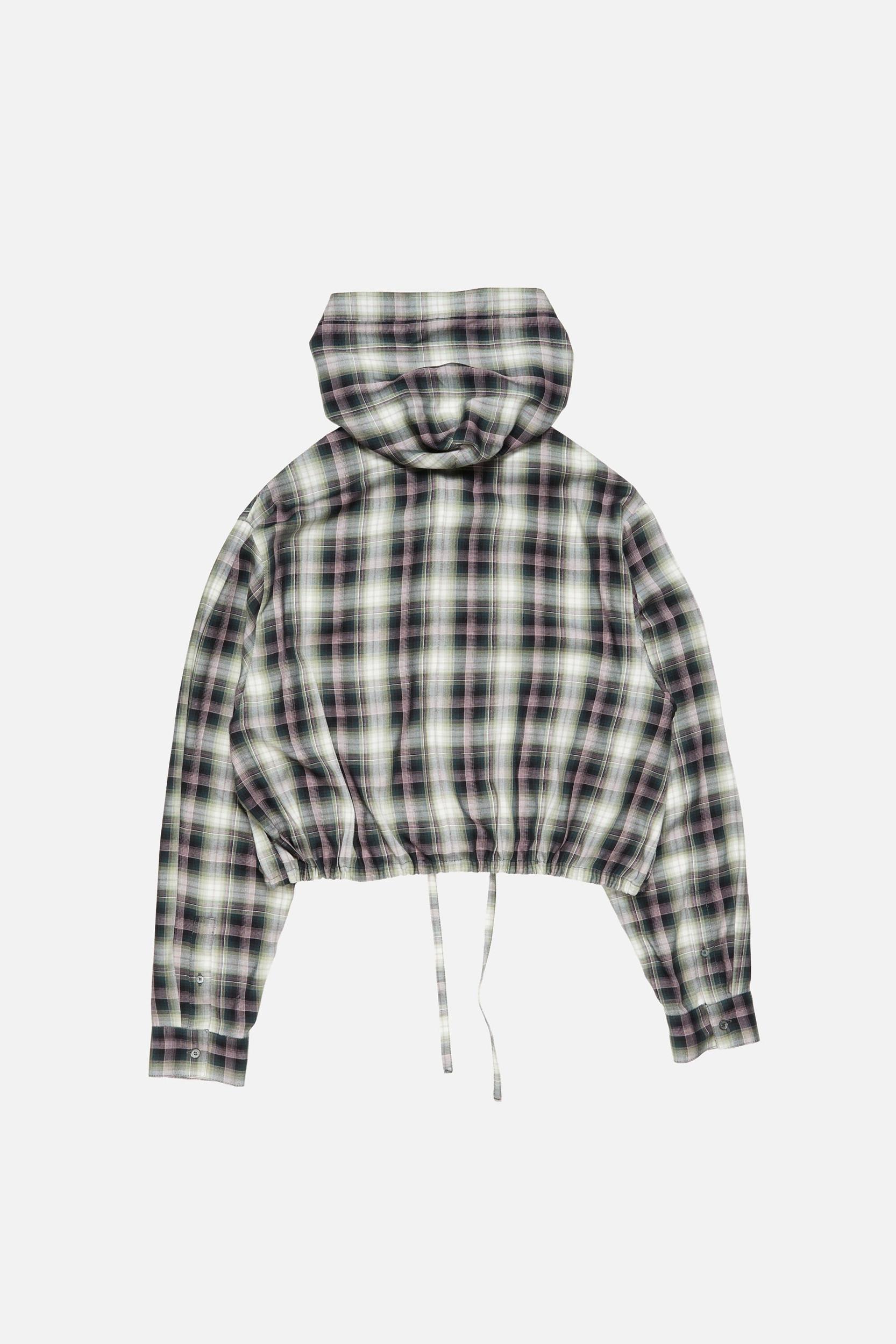 Hooded overshirt features a flannel check pattern and branded logo tab at the front. Designed with a centre front button-up closure and shirt cuffs. Complete with drawcords at the hood and hem and side seam pockets. Cut to a relaxed fit and hip length. FN-WN-BLOU001157