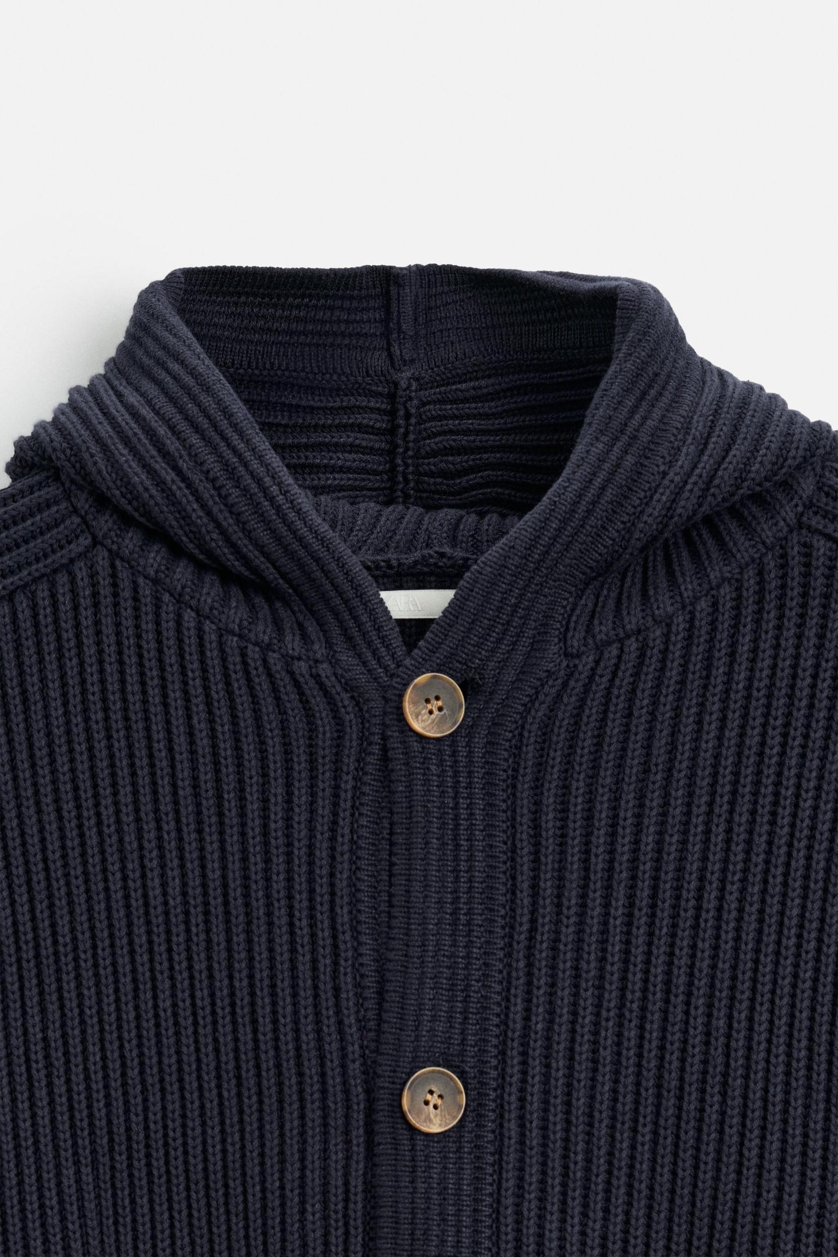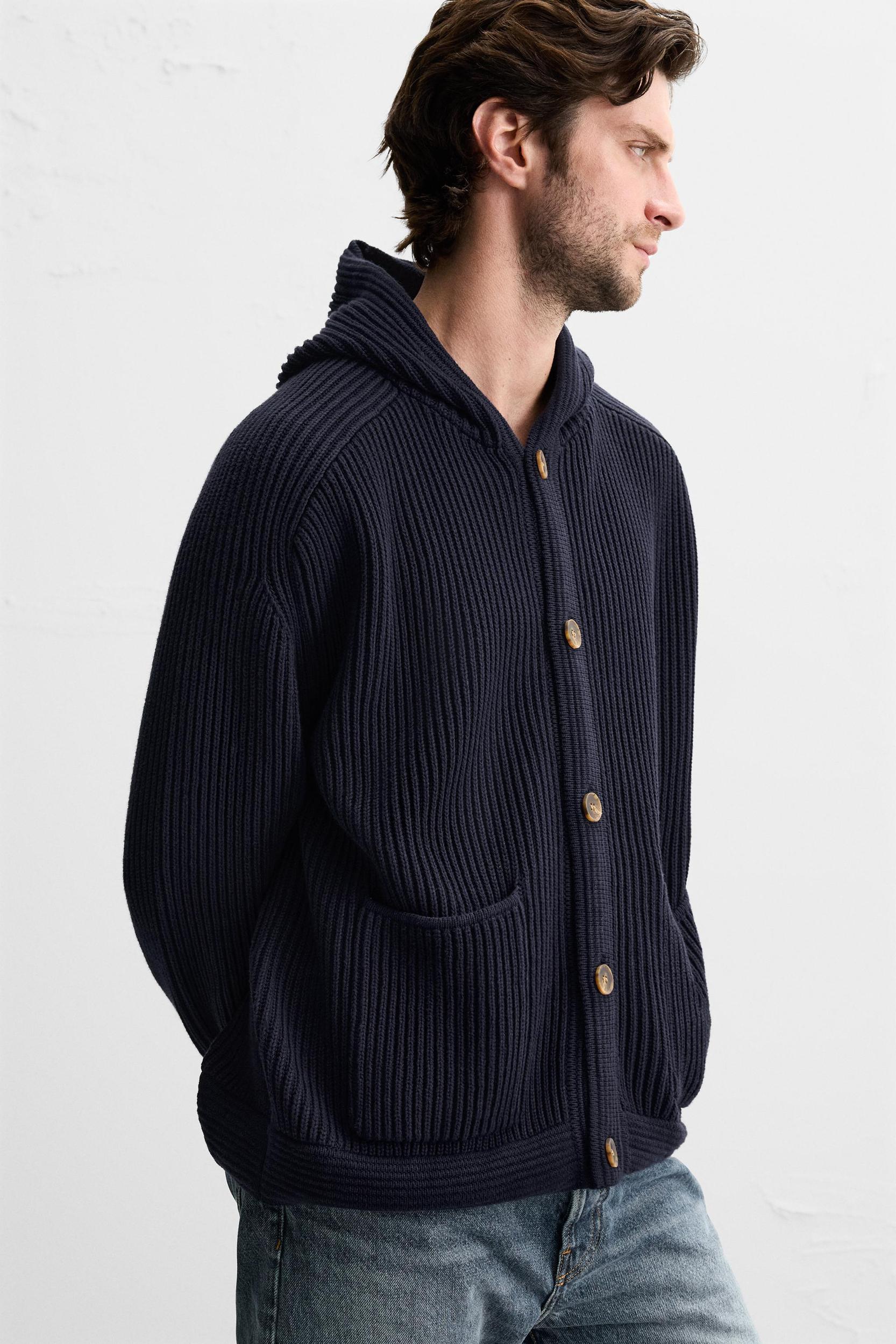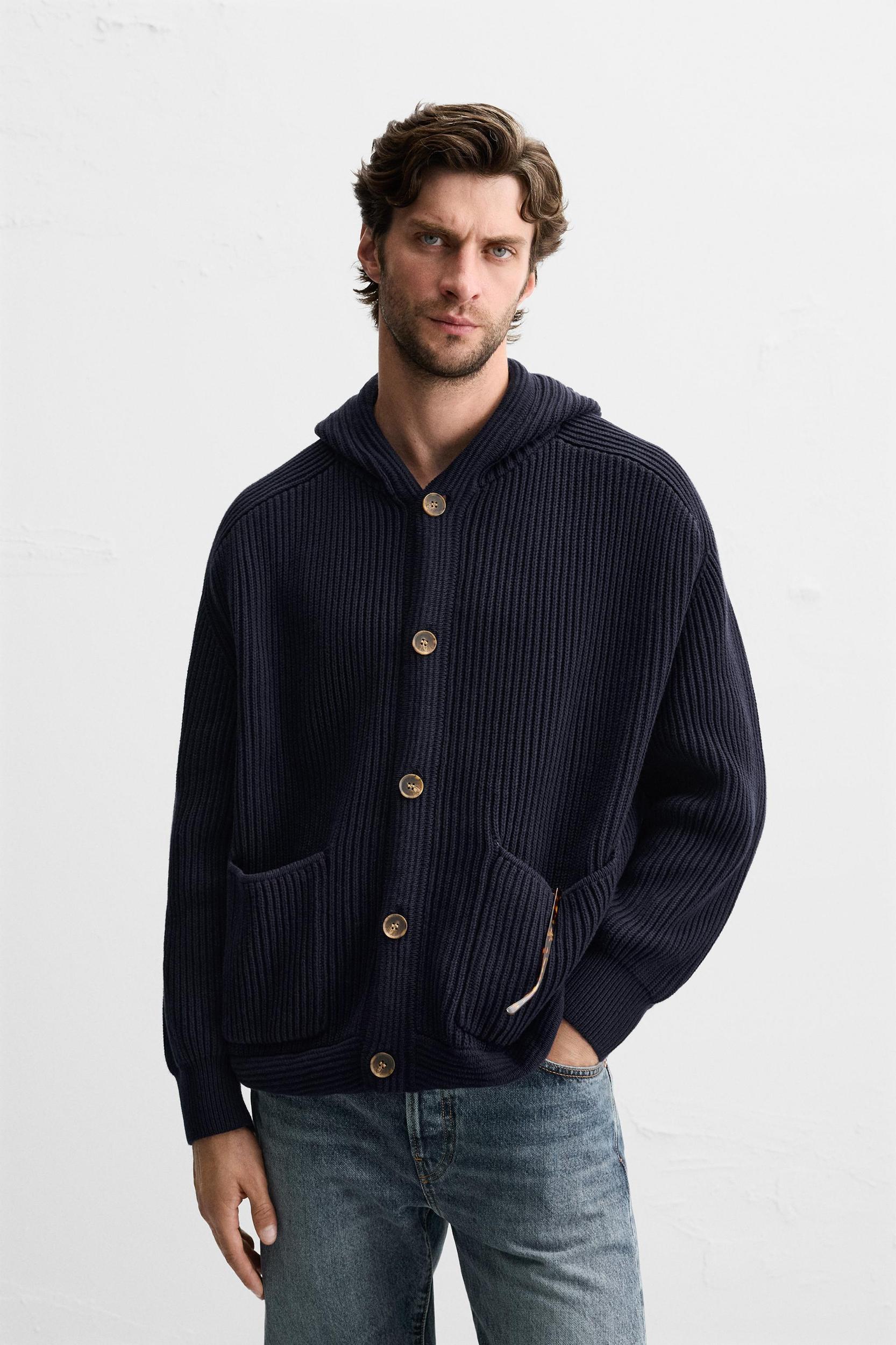 Relaxed fit cotton knit cardigan. Hooded collar and long sleeves. Patch pockets at the hip. Ribbed trim. Front button closure.