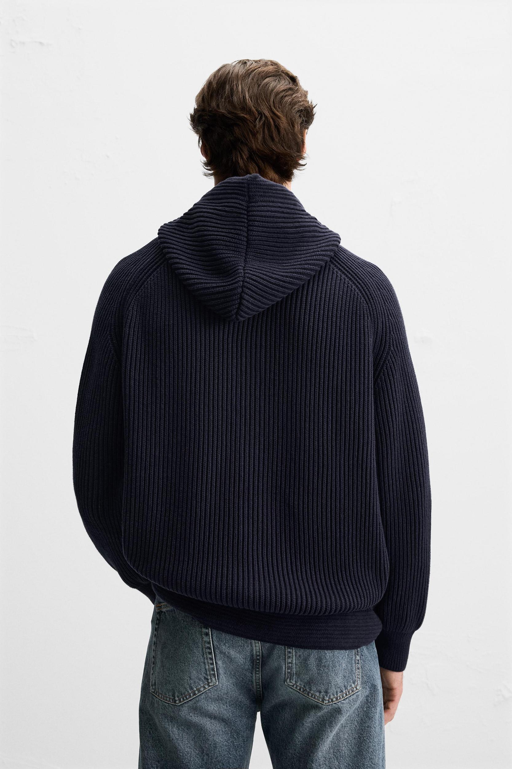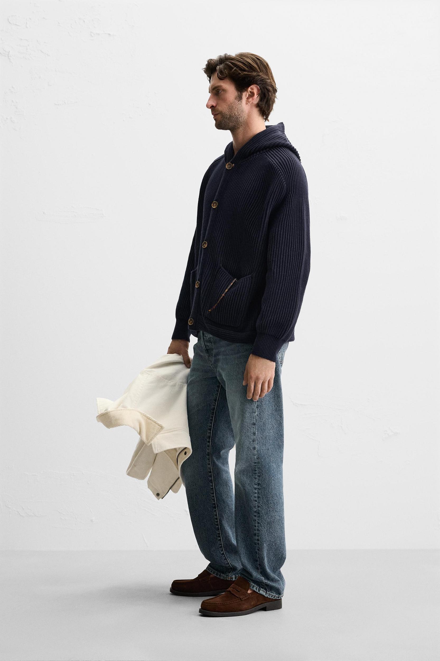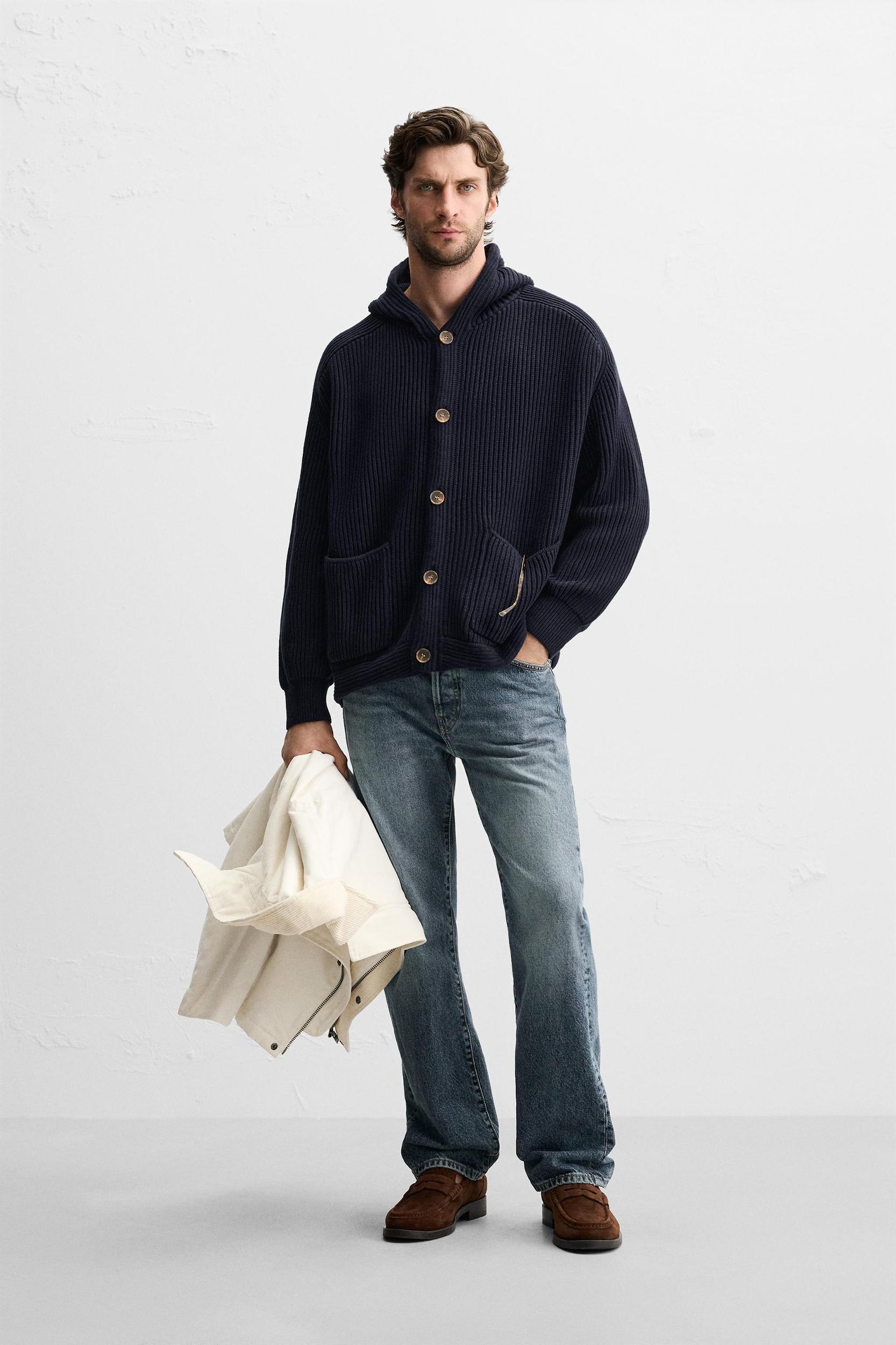 Relaxed fit cotton knit cardigan. Hooded collar and long sleeves. Patch pockets at the hip. Ribbed trim. Front button closure.