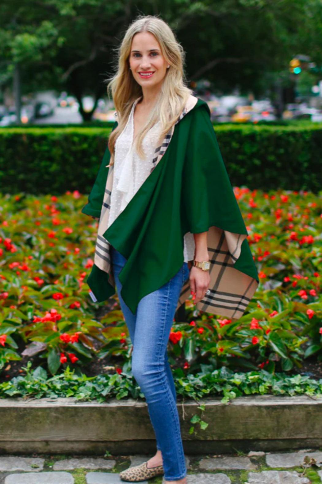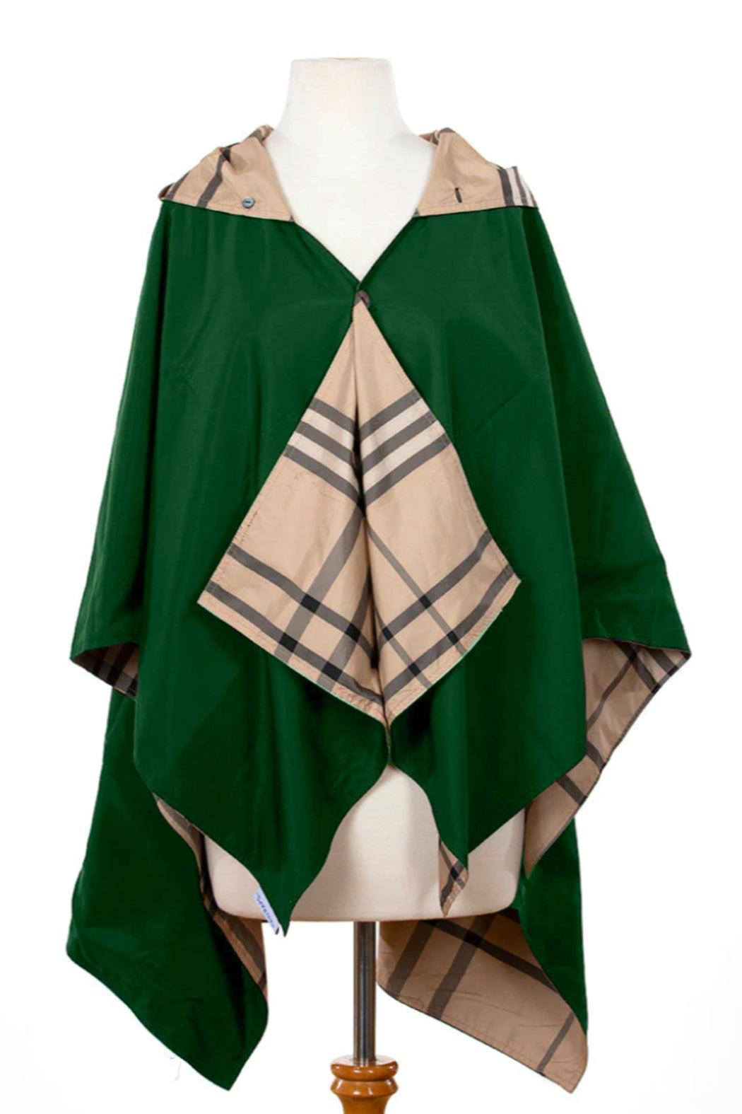 The RAINRAP is a fashionable and practical alternative to traditional bulky rain gear. The design of the RAINRAP combines the popular style of the pashmina and wrap. The RAINRAP is water-repellent, reversible, lightweight, fast-drying, has two shell buttons, a concealed magnetic closure and is easy to store in its matching black travel pouch. The RAINRAP is one size fits most, is 100% polyester that is treated for water repellency, measures 25" from the neckline down to the back hem. The width is 50" and it weighs 10 ounces. The pouch size is 10"x8". Machine wash on cold, gentle cycle. Hang to dry or dry on a delicate cycle. Do not dry clean. Do not iron.