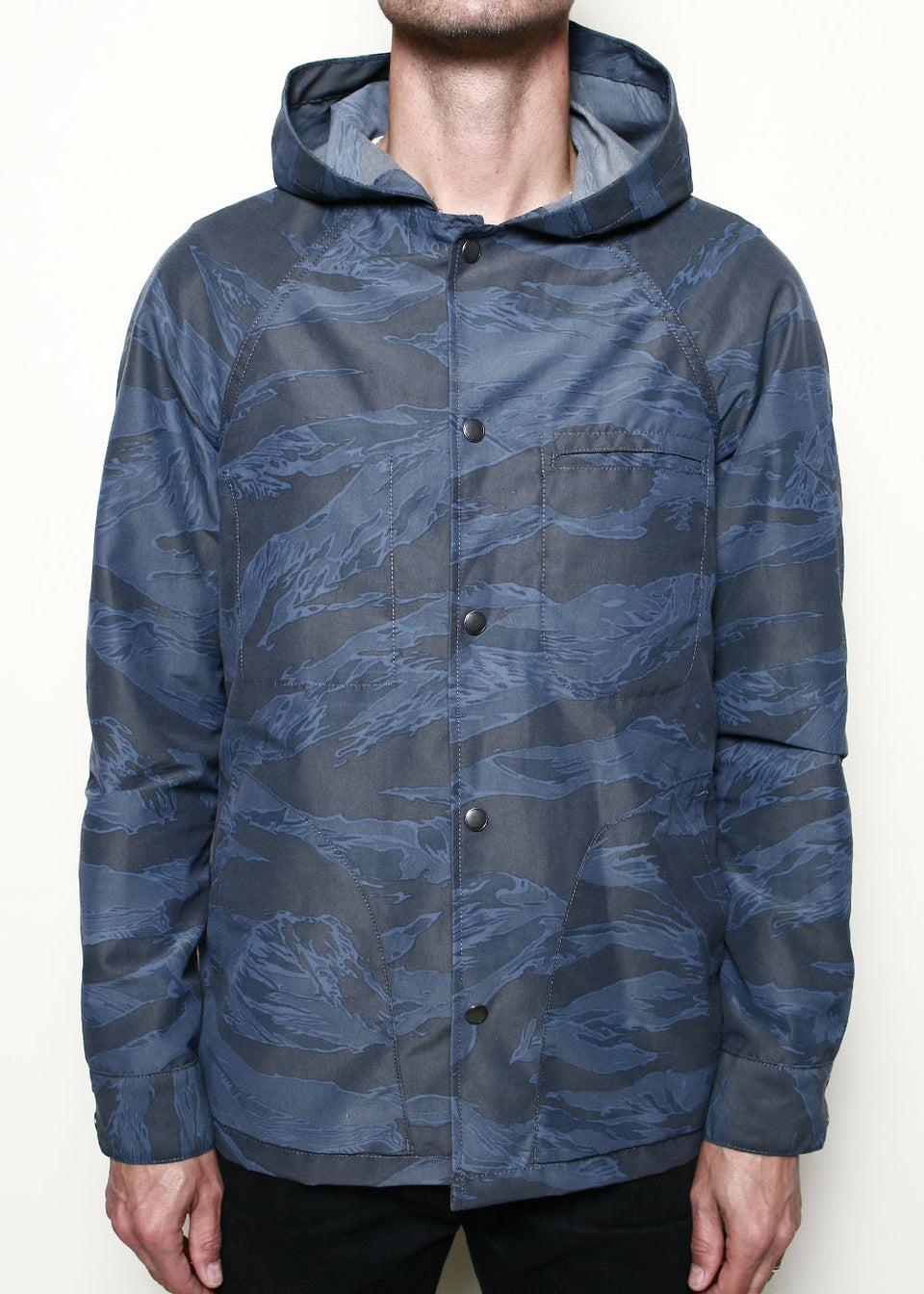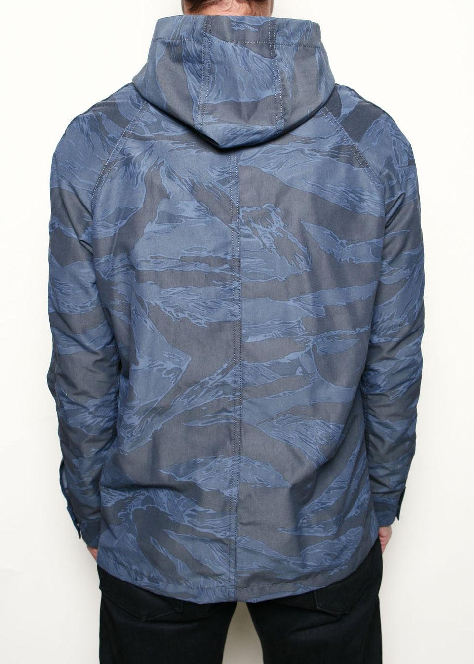 FIT // Slim Fit FABRIC // 62% cotton / 38% nylon printed plain weave made in Japan – 2 exterior patch hand warmer style pockets– Large 3 panel attached hood– Exterior welt chest pocket– Interior left chest pocket– Raglan sleeves– Antiqued snaps– Natural herringbone locker loop– Sewn in Los Angeles, Calif. HOW WE MEASUR
