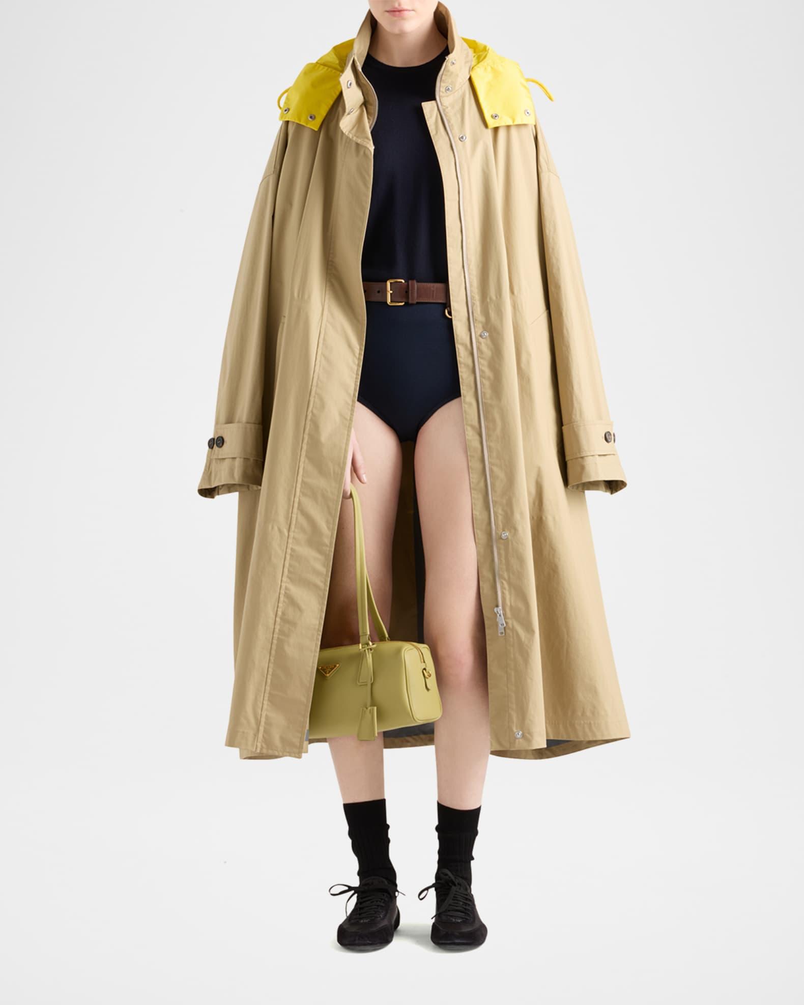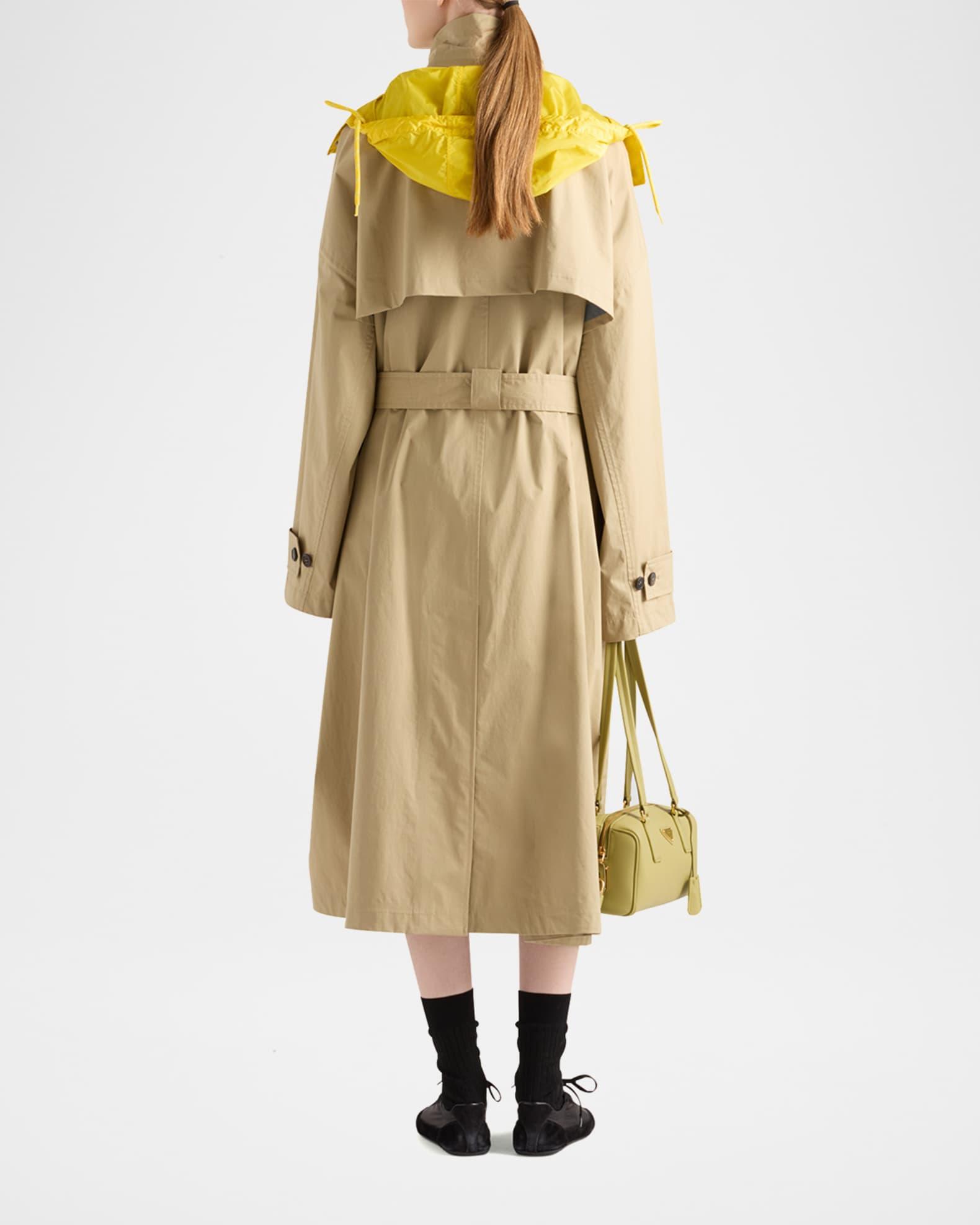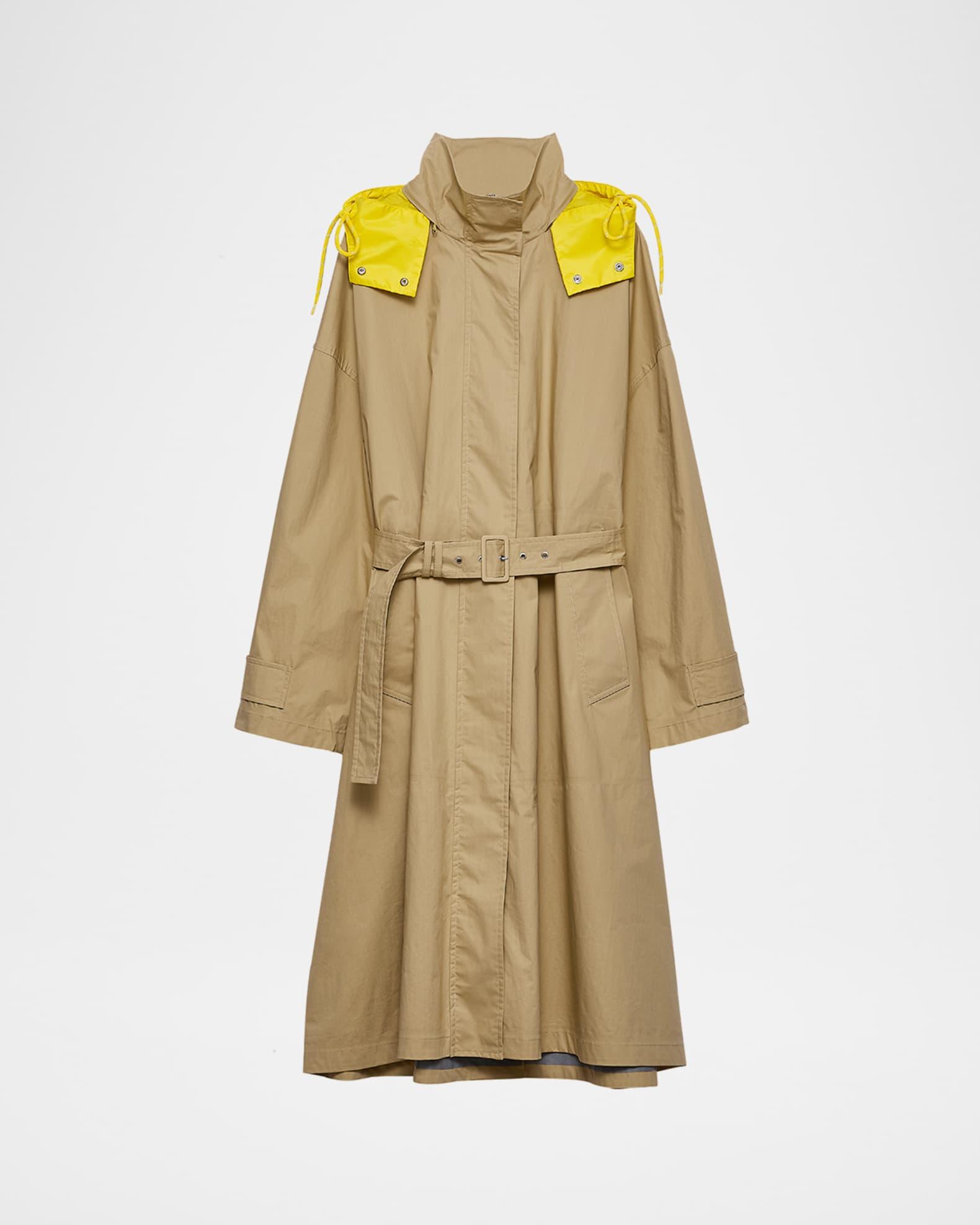 Prada raincoat in technical poplin fabric comes with a hood in a contrasting shade and heat-sealed taped seams Stand-up collar with an extractable hood Zipper closure Long sleeves Cuffs with strap and button Wide welt pockets Fabric belt with fabric-covered buckle Oversized fit Back vent Cotton Dry clean, professional cleaning recommended Imported