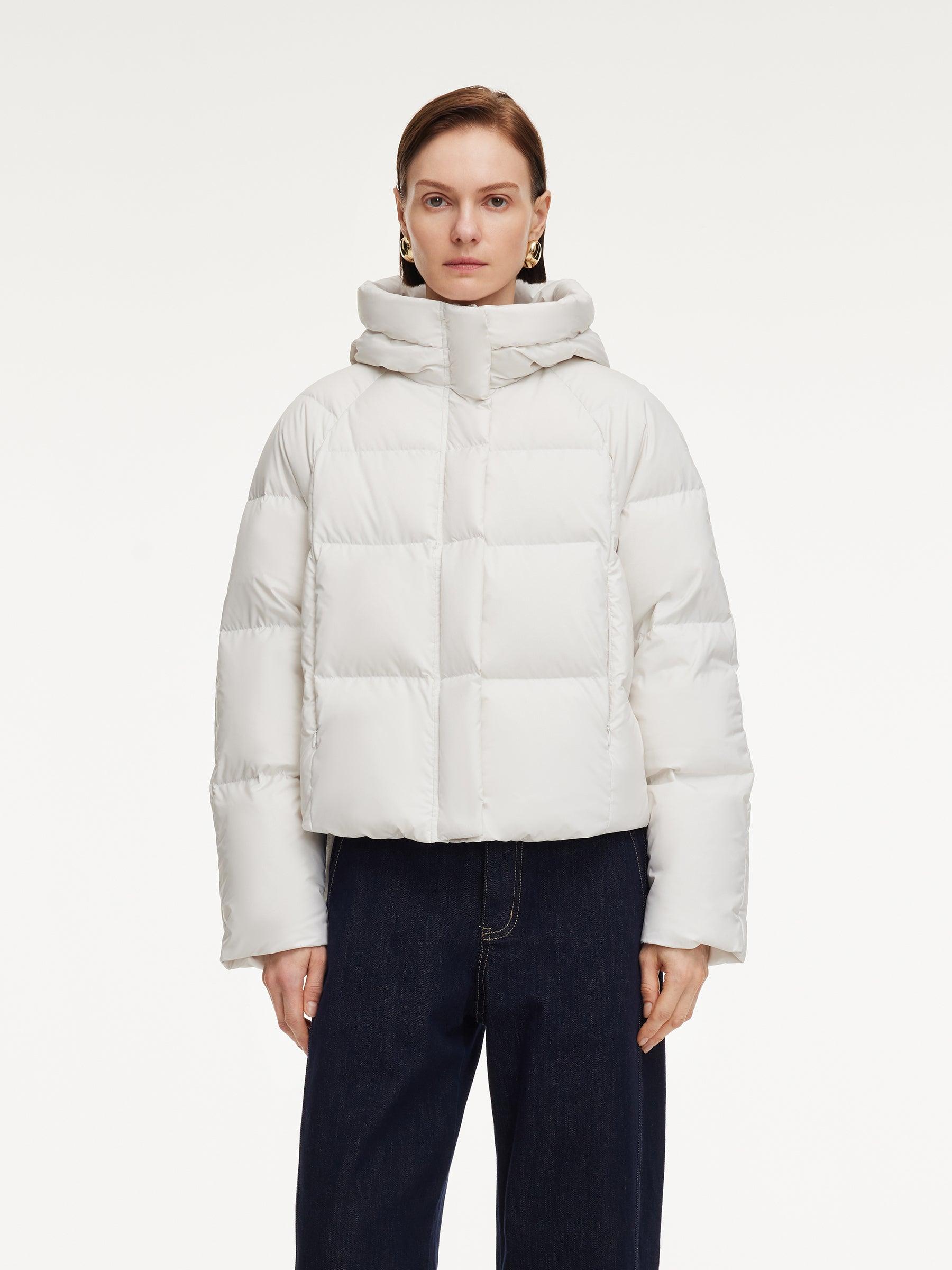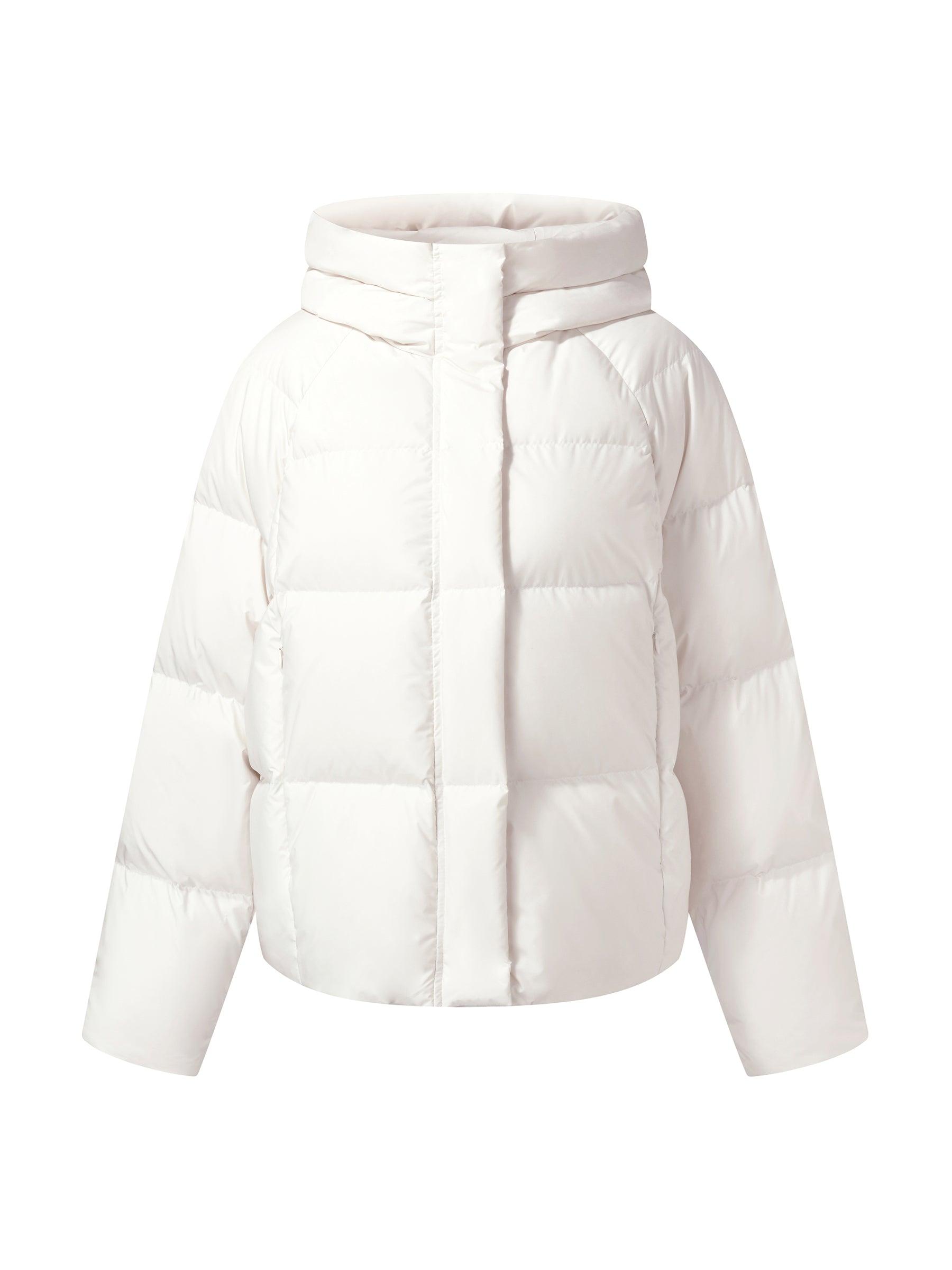 -95% down content and 90% down cluster content -Water-repellent and windproof -With pockets Filled with 95% premium white goose down, this goose down jacket features seamless anti-down technology and a fabric that resists water, oil, and stains. The relaxed fit with a high-neck hood ensures superior warmth, while an in