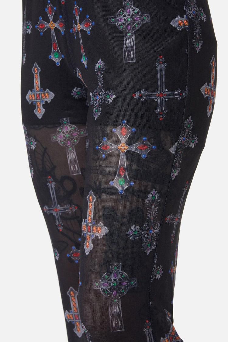 Find your stride with an irreverent edge in these Mesh Pants from Dangerfield. Crafted to create a striking silhouette, the flared leg sweeps with a bold and playful flair. Beneath the sheer outer shell, which whispers tales of maverick charm, there's a clandestine layer of shorts offering a dash of modesty while inviting a glimpse of mystery. This fitted number with its snug shape showcases an audacious all-over printed crucifix pattern, dialing up the drama on classic black. The elasticated waistband assures that your comfort is never compromised, hugging gently while granting ease for life's spontaneous jaunts. Made entirely from a gossamer polyester, they're a statement piece meant for moonlit festivals or an offbeat coffee shop rendezvous. Embrace your unique spirit with a pair that claims the spotlight as you weave through your urban adventures.100% PolyesterCold Machine Wash Do Not Bleach Or Soak Do Not Wring Or Spin Do Not Tumble Dry Cool Iron On Reverse If RequiredImported