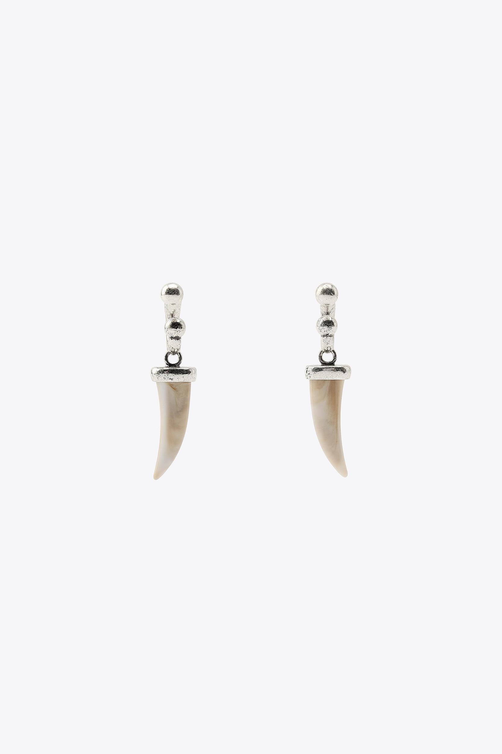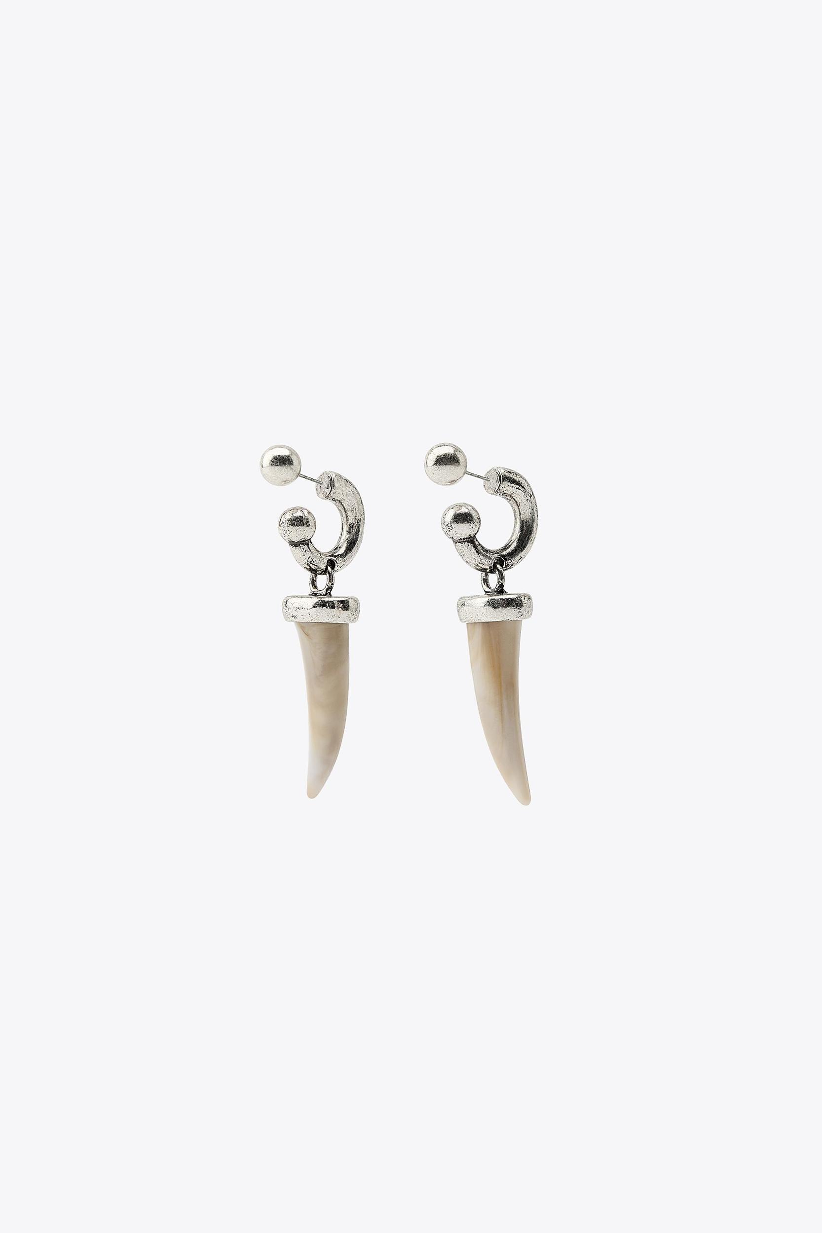 Metal hoop earrings. Resin horn pendant. Butterfly closure.
