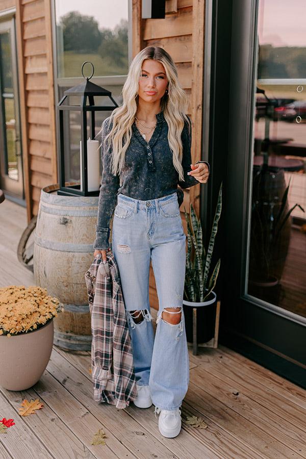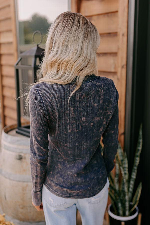 - Spice up your fall wardrobe with this stylish waffle knit top! Its vintage wash and distressed detailing give it a subtly edgy vibe, perfect for putting a trendy twist on everyday style. - Unlined waffle knit material with a vintage wash and a subtle stripe pattern - A v-cut neckline with distressed detailing - A three buttoned bodice - Long sleeves with double layered unfinished cuffs - A flattering silhouette that ends in a curved hemline