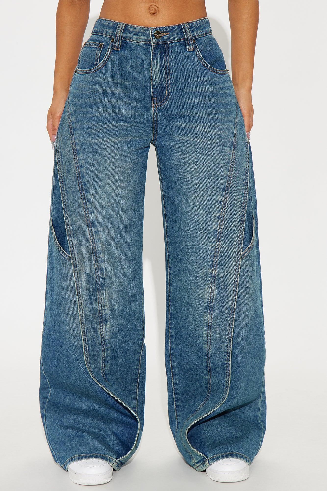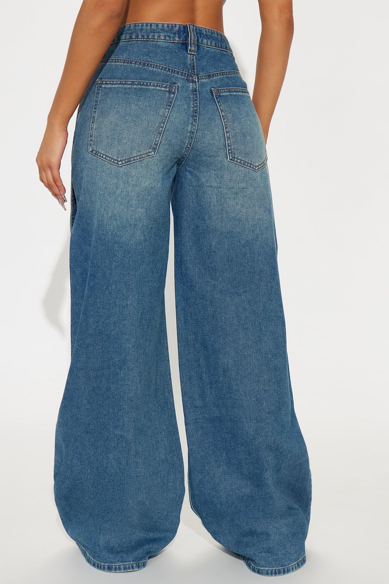 Available In Medium Wash. Wide Leg Jean 5 Pocket Flap Overlay Utility Pockets 11" Rise 33" Inseam Non Stretch Disclaimer: Due To The Specialized Wash Process, Each Garment Is Unique. 100% Cotton Imported California Proposition 65WARNING: Cancer and Reproductive Harm - www.P65Warnings.ca.gov.