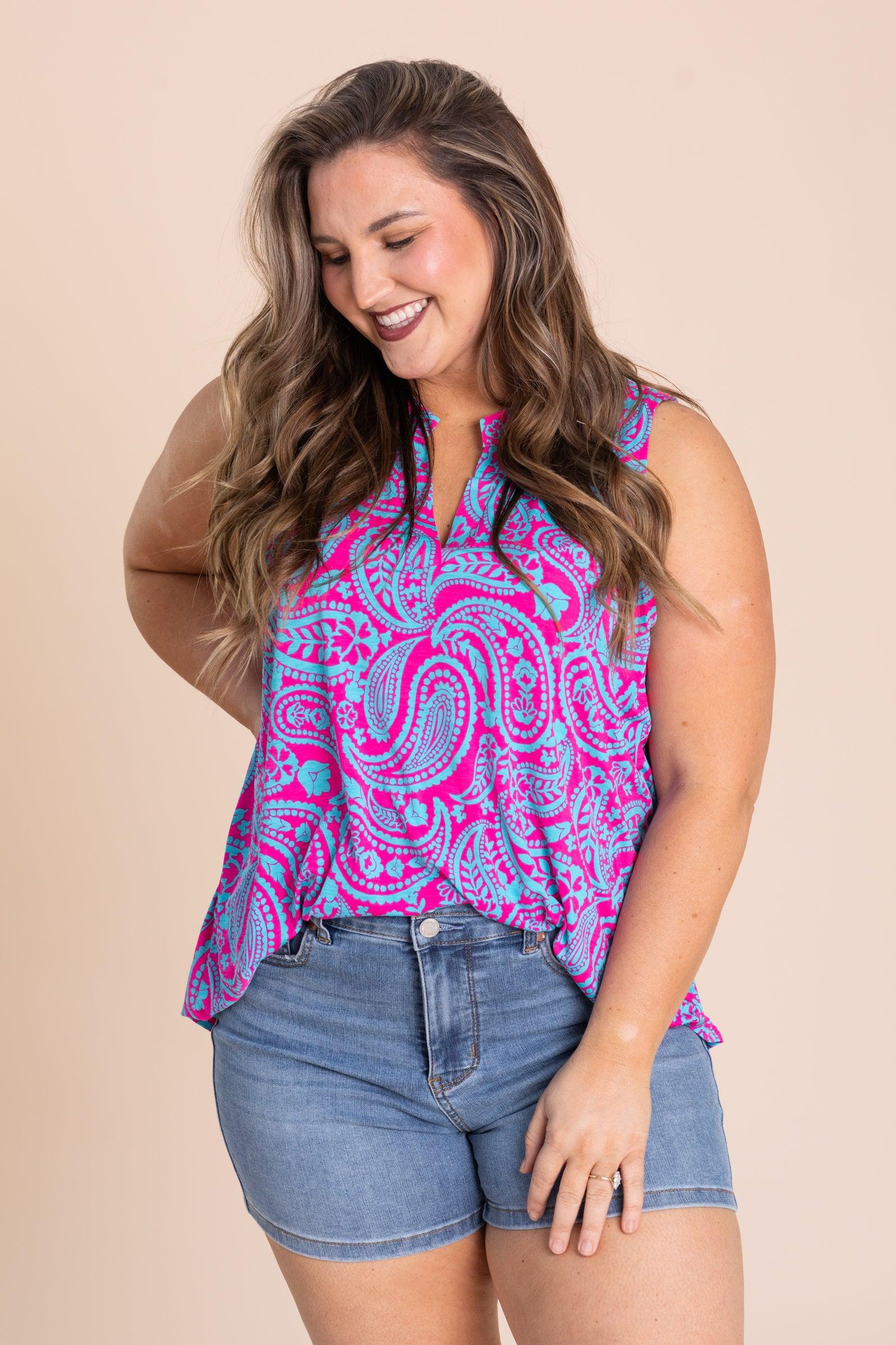 Product Details Colors: Hot Pink, Aqua Print: Floral/ Paisley Neckline: V-Neck Sleeves: Sleeveless Hemline: Round Brand: Dear Scarlett Material and Care 94% Polyester 6% Spandex Hand Wash Cold Line Dry Size and Fit Small: Bust 36" Waist 38" Length 26" Medium: Bust 38" Waist 40" Length 26.5" Large: Bust 40" Waist 42" Length 27" X Large: Bust 42" Waist 44" Length 27.5" 2X Large: Bust 45" Waist 47" Length 28.5" 3X Large: Bust 48" Waist 50" Length 29.5" Model A is 5'7 and is wearing a size small Model B is 5'8 and is wearing a size large