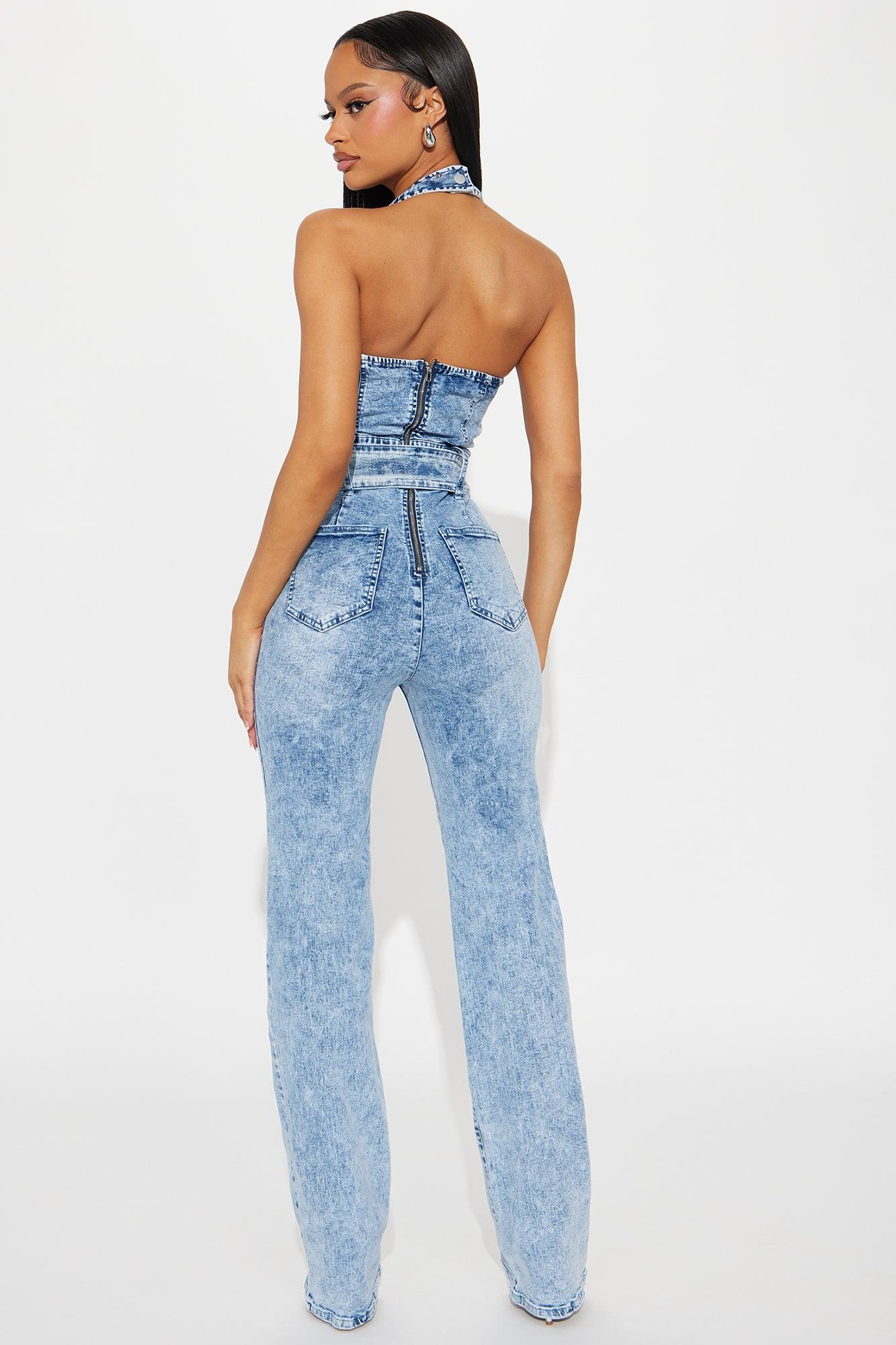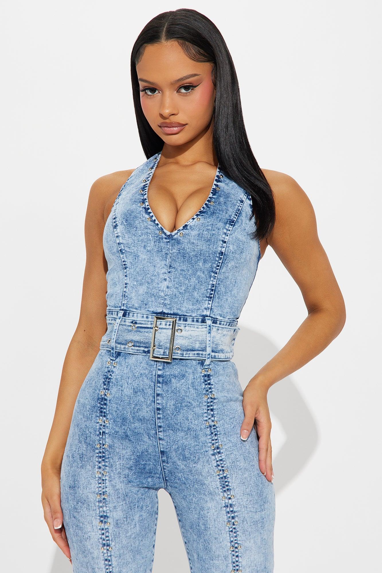 Available In Medium Wash. Denim Jumpsuit Halter V-Neck Studded Belted Back Zipper Straight Leg Inseam = 32" Disclaimer: Due To The Specialized Wash, Each Garment Is Unique. Self: 74% Cotton 23% Polyester 2% Viscose 1% Spandex Imported California Proposition 65 WARNING: Cancer and Reproductive Harm - www.P65Warnings.ca.gov.