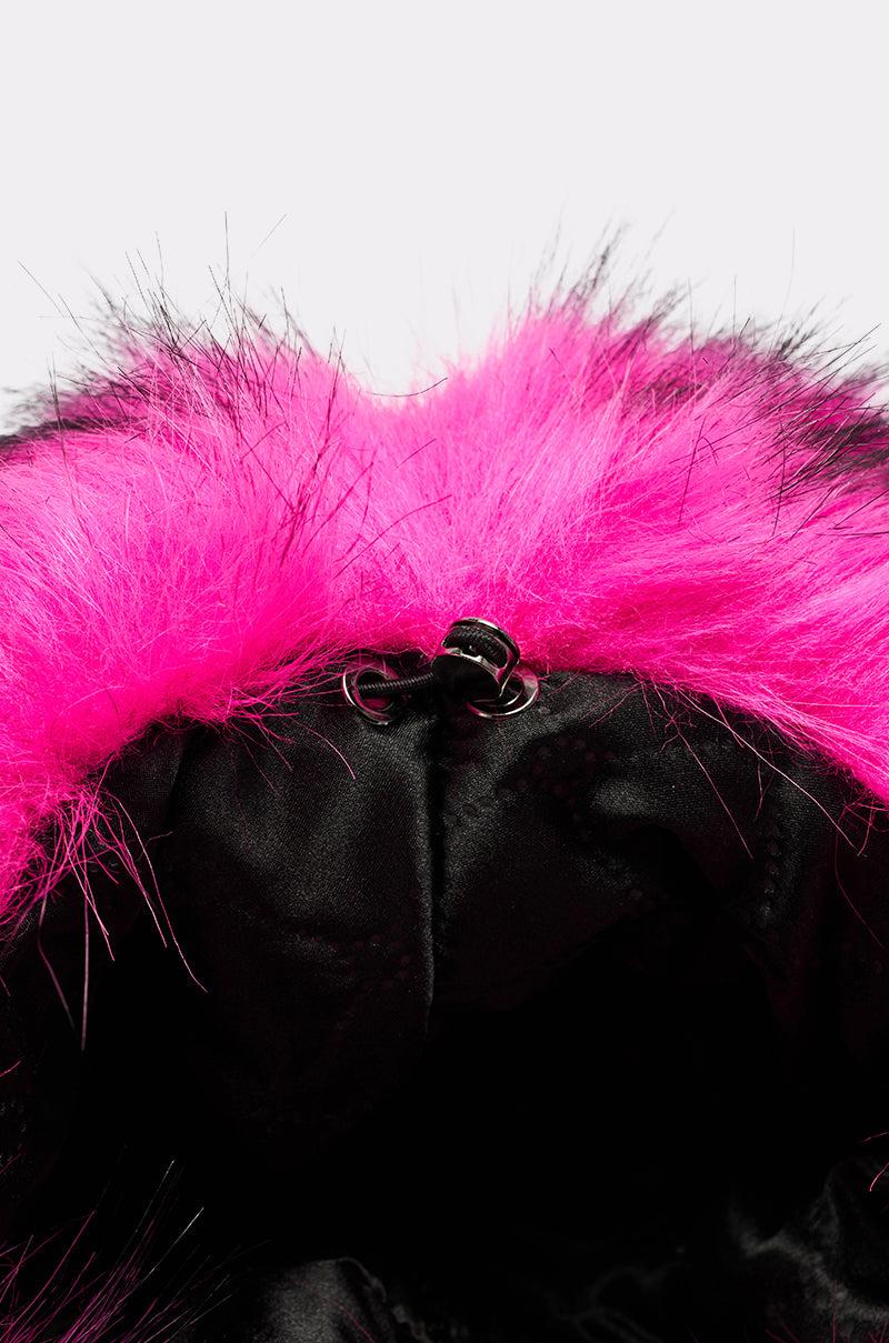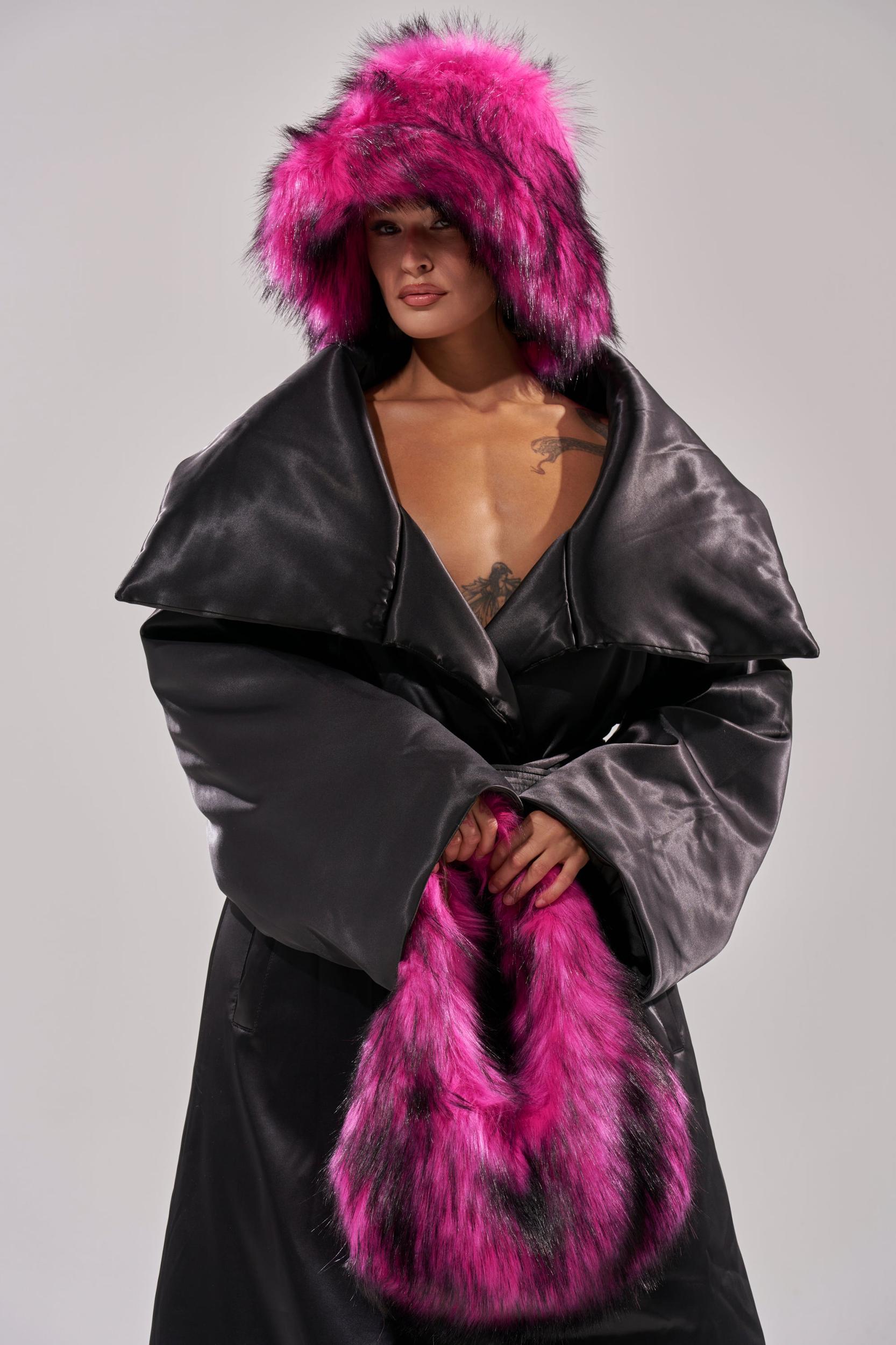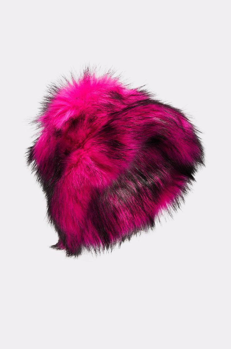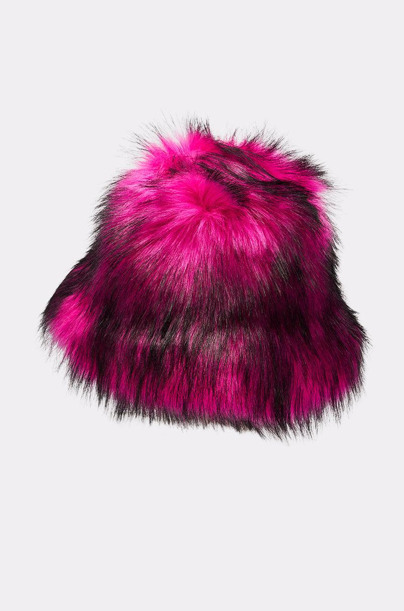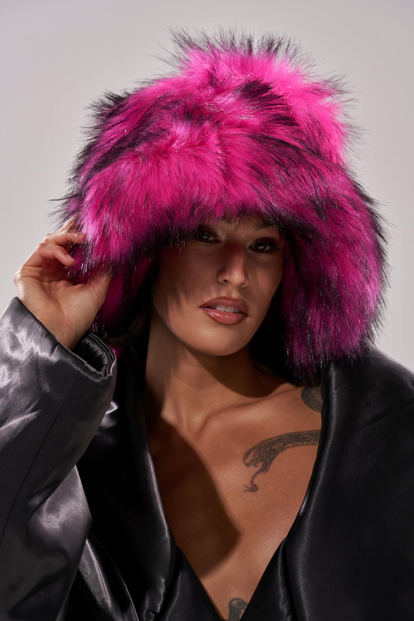 Hats off to The AKIRA Label Hottie Faux Fur Bucket Hat. Crafted from ultra-plush faux fur in a bright pink and black colorway, this oversized accessory features a floppy bucket hat silhouette, a flat crown, and a downturned brim. The inside boasts a satin quilted inner lining and an adjustable bungee cord fastening. - 100% Acrylic- Imported (all measurements approximate from size O/S)- 28” Head Circumference- 8” DiameterProduct ID: 1071838
