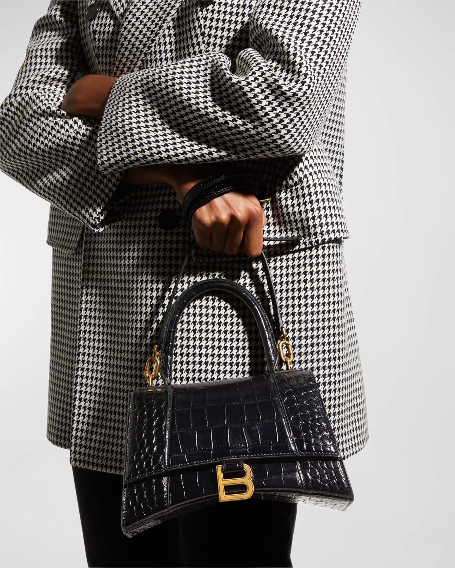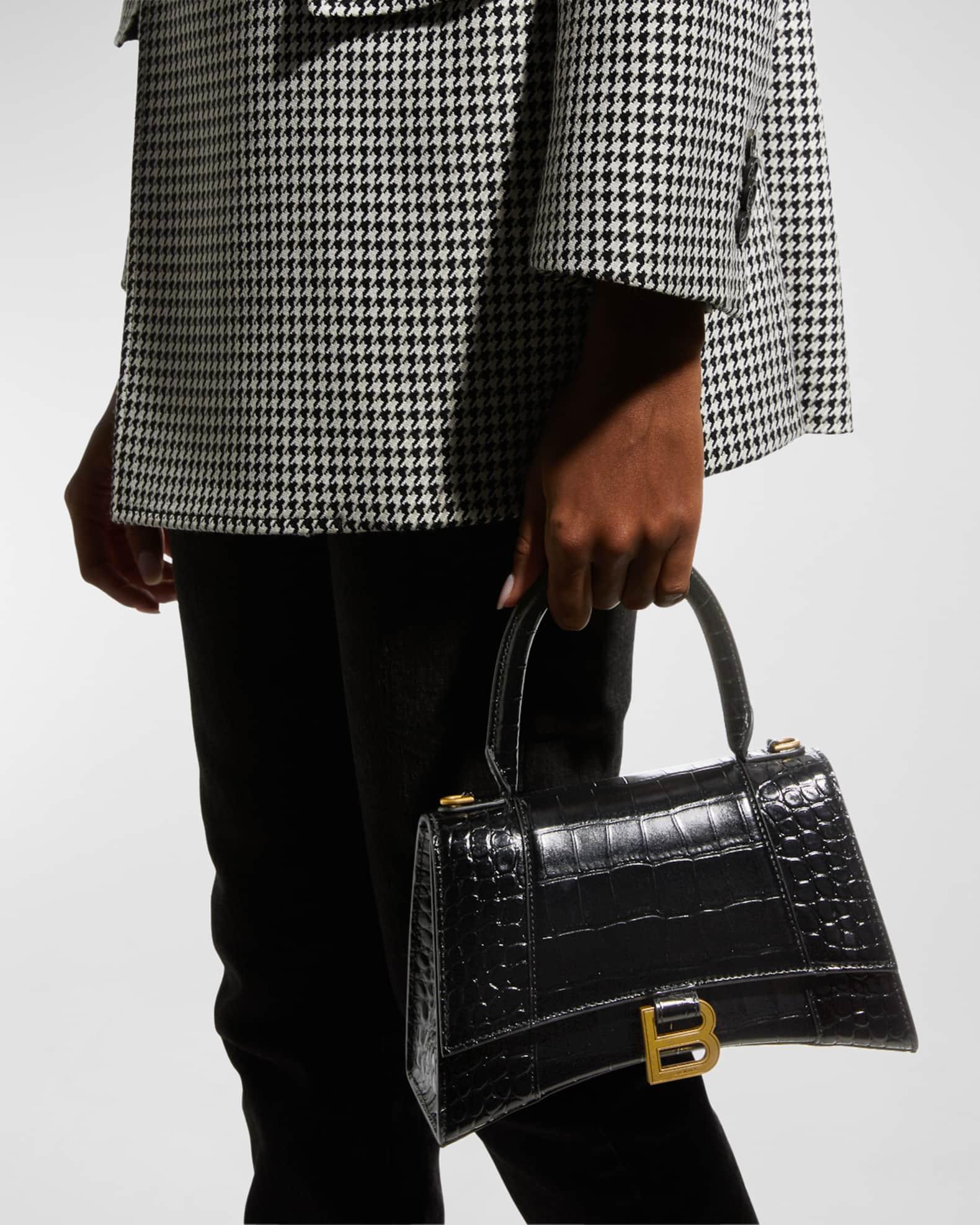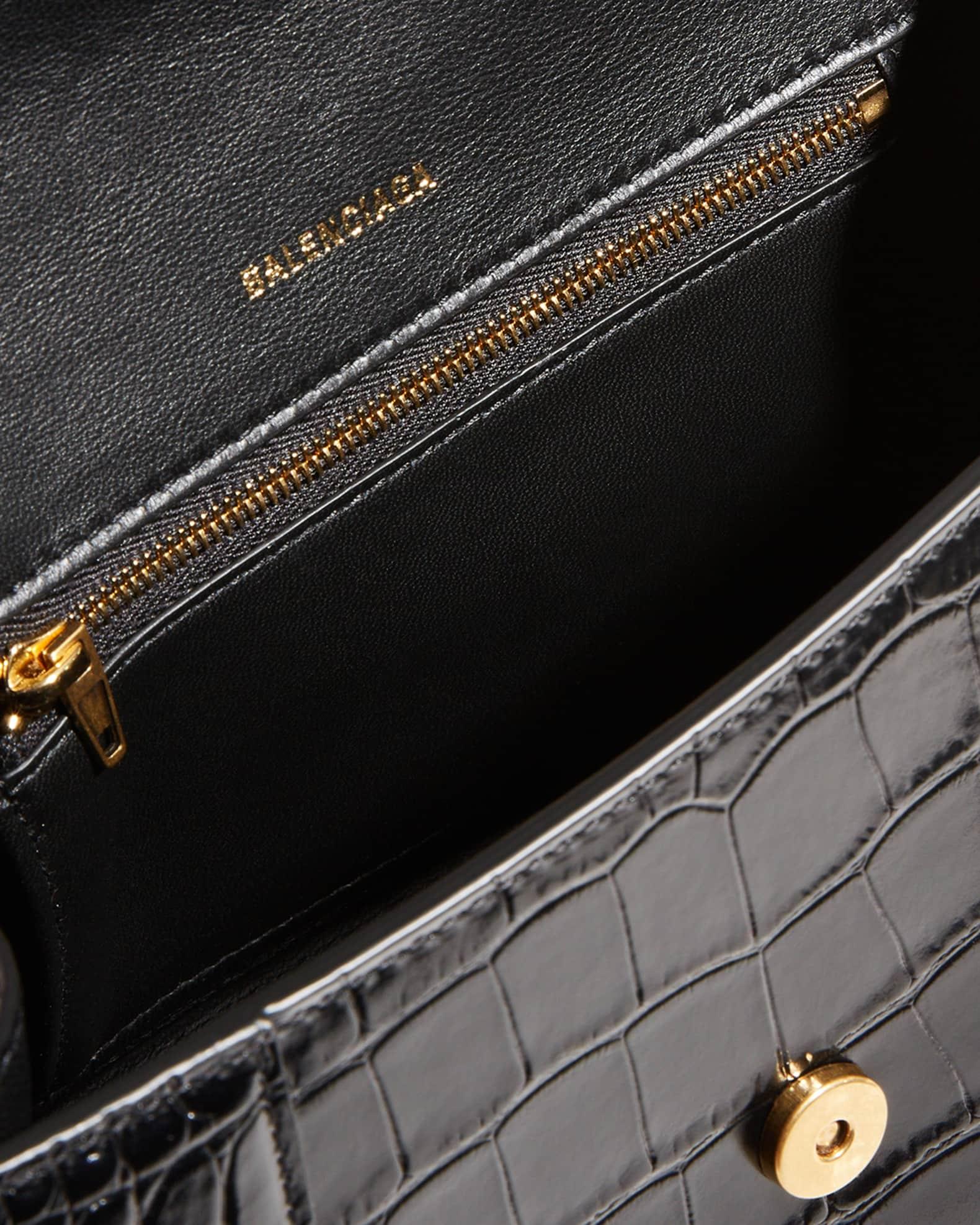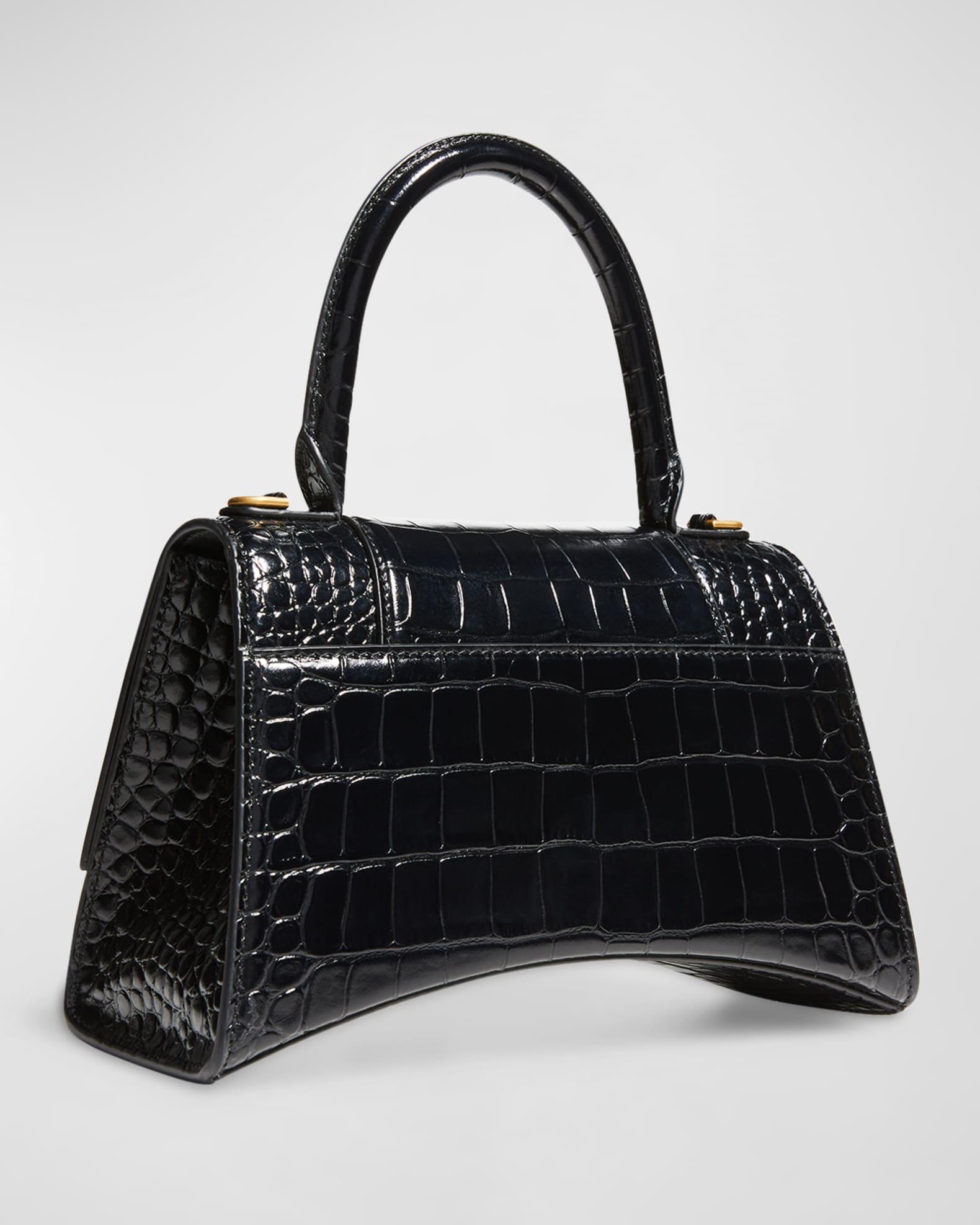 Balenciaga top-handle bag in crocodile-embossed calfskin leather. Rolled top handle. Removable, adjustable crossbody strap (21.6") Flap top with hanging "B" hardware; snap closure. Exterior, slip compartment at back. Interior, one slip pocket. 5.5"H x 9.1"W x 3.9"D. Made in Italy.