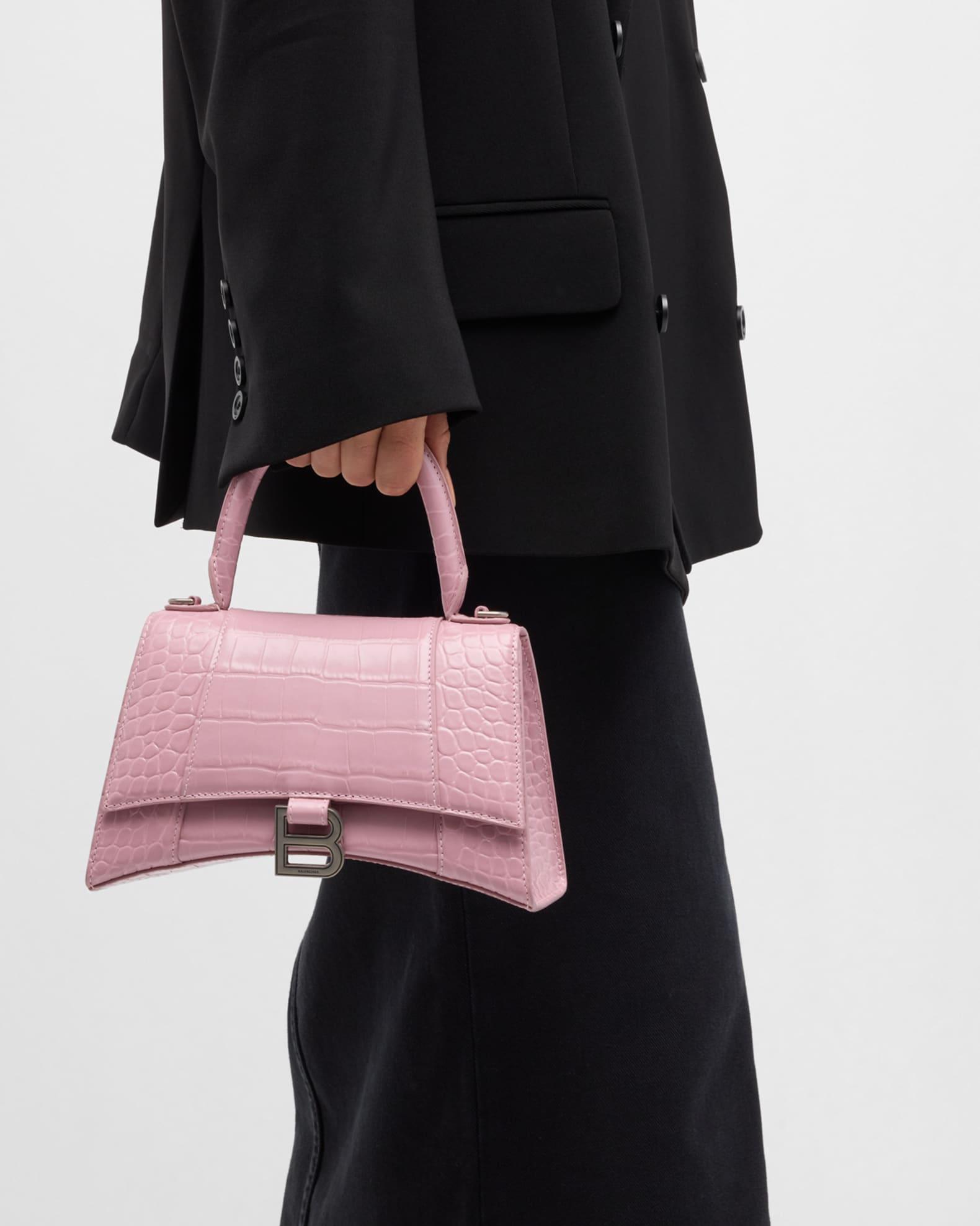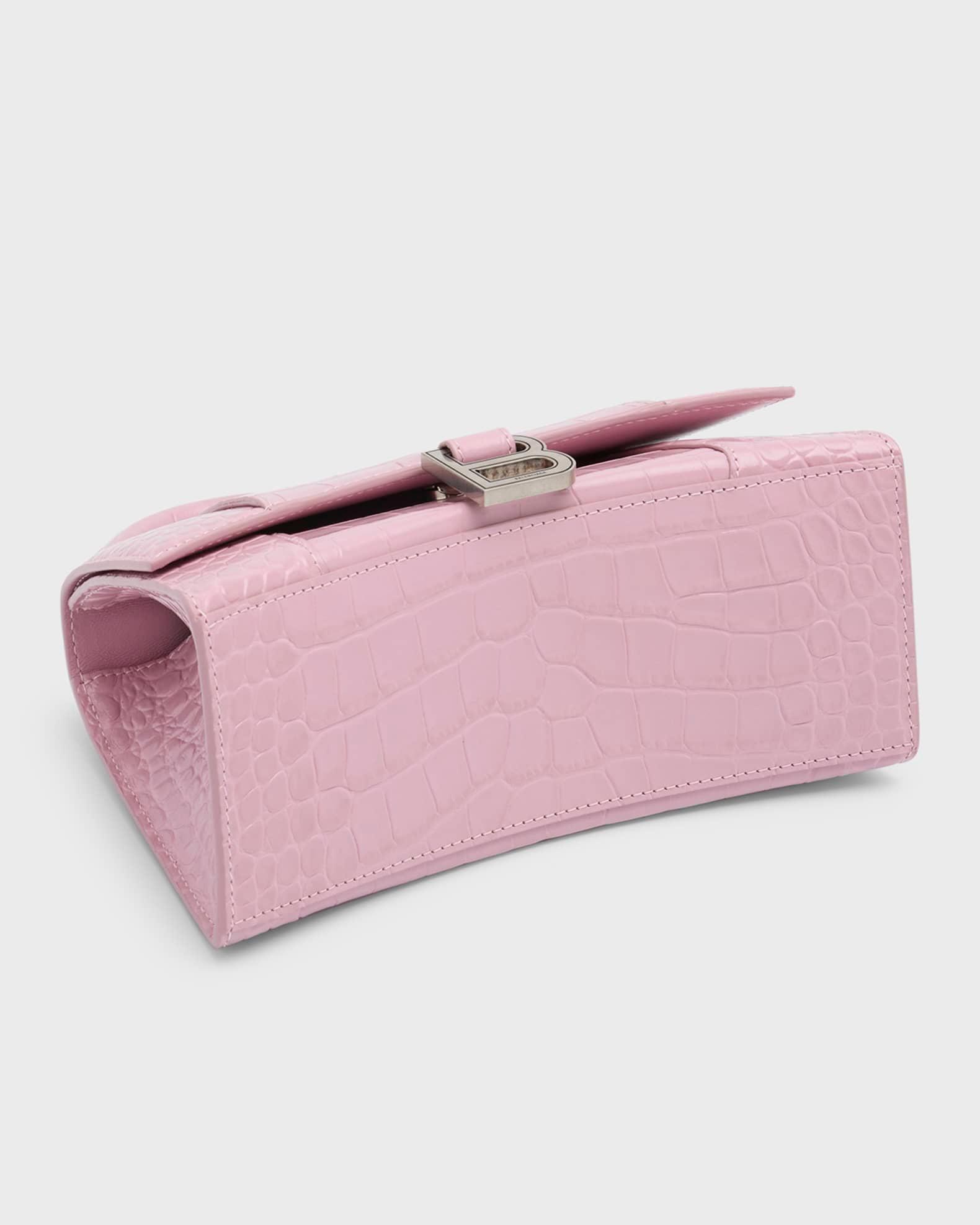 Balenciaga top-handle bag in shiny crocodile-embossed calfskin. Rolled top handle. Removable, adjustable crossbody strap 21.6" Flap top with hanging "B" hardware; snap closure. Exterior, slip compartment at back. Interior, one slip pocket. Item weighs approx. 1.3 lb./ 0.6 kg. 5.5"H x 9.1"W x 3.9"D. Made in Italy.
