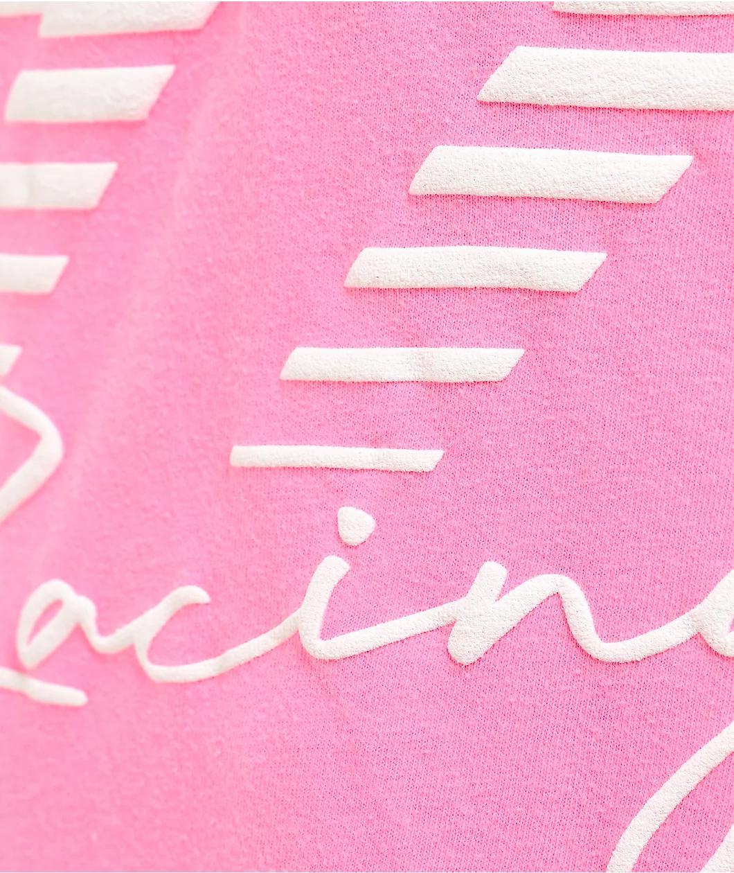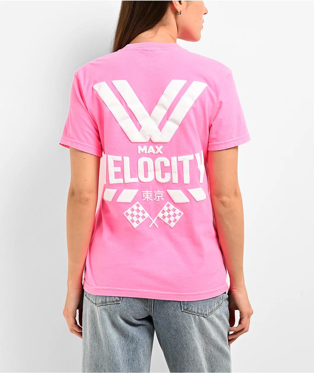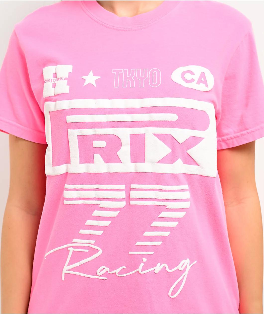 House of PRIX offers the Max Velocity t-shirt in a bright neon pink cotton construction utilizing textured, puff-printed graphics on the front and back for a retro look with futuristic influence. Exercising loud Collete Davis branding on either side,