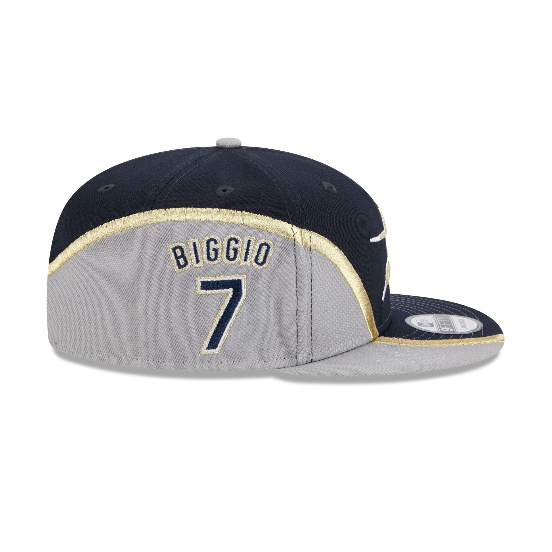 The Houston Astros Craig Biggio 9FIFTY Snapback features an embroidered Astros Cooperstown logo at the front panels with the player's name and number at the right-wear side. Additional details include a snapback closure at the rear and a gray undervisor.