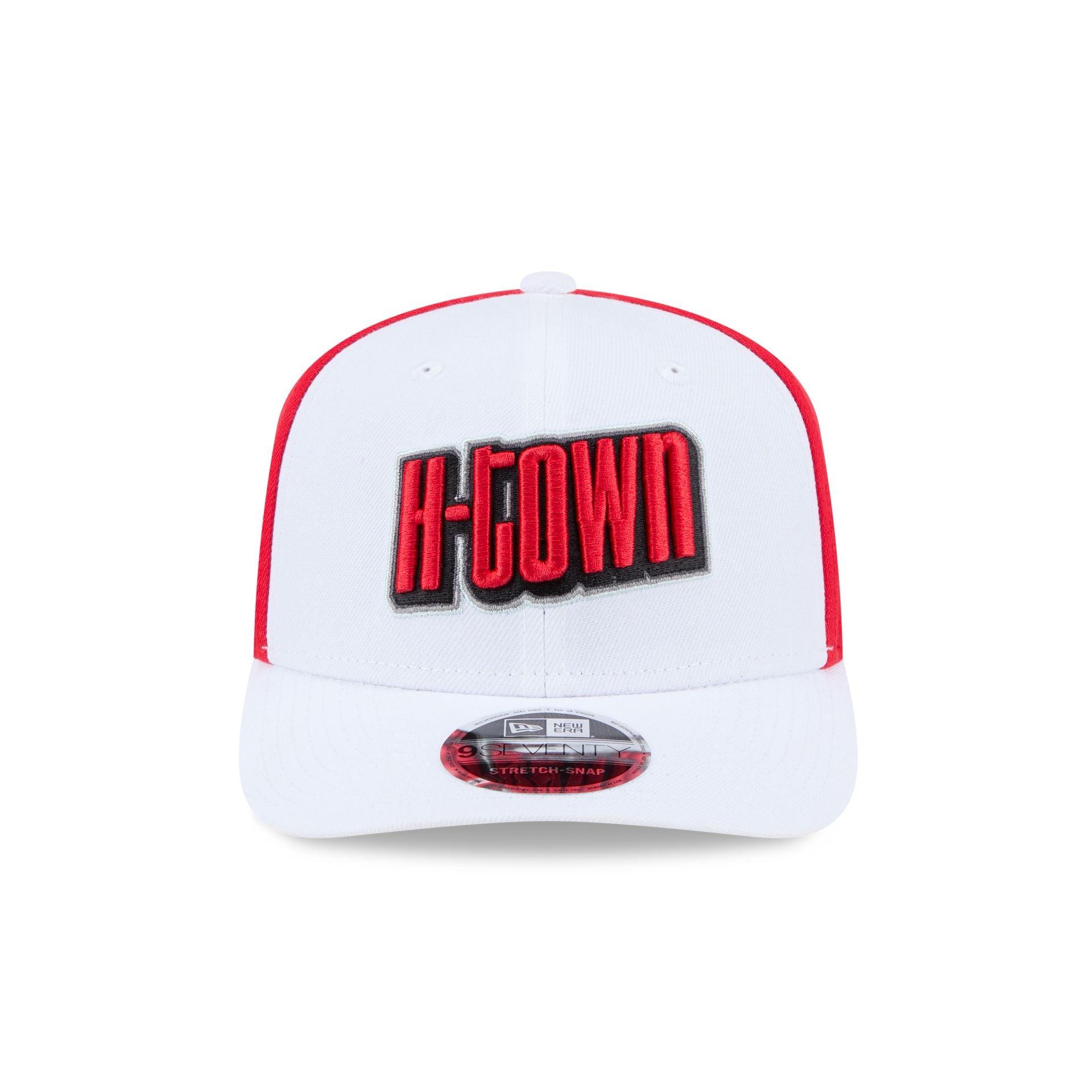 The Houston Rockets 2024 City Edition 9SEVENTY Stretch-Snap Cap features an embroidered Rockets H-Town wordmark at the front panels with an NBA Logoman above a snapback closure at the rear. Additional details include a team logo at the right-wear side and a gray undervisor.