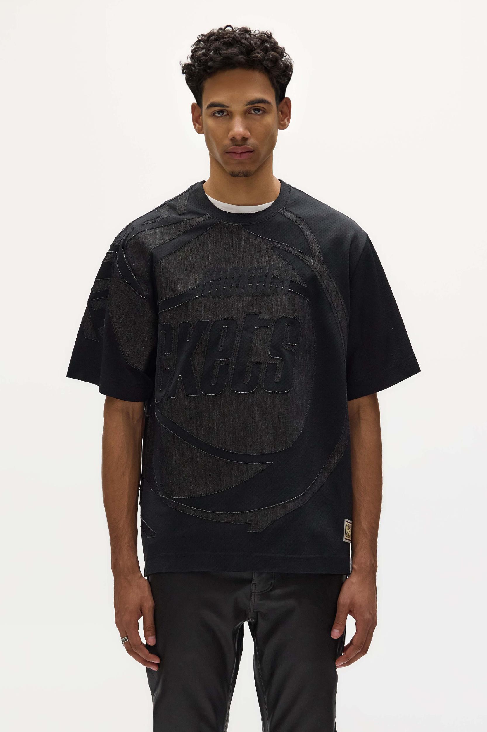 This oversized tee is cut from 100% polyester sport mesh with a raw edge finish at the neck & hem. White Label 100% Polyester Oversized Fit Heavyweight All Over Applique