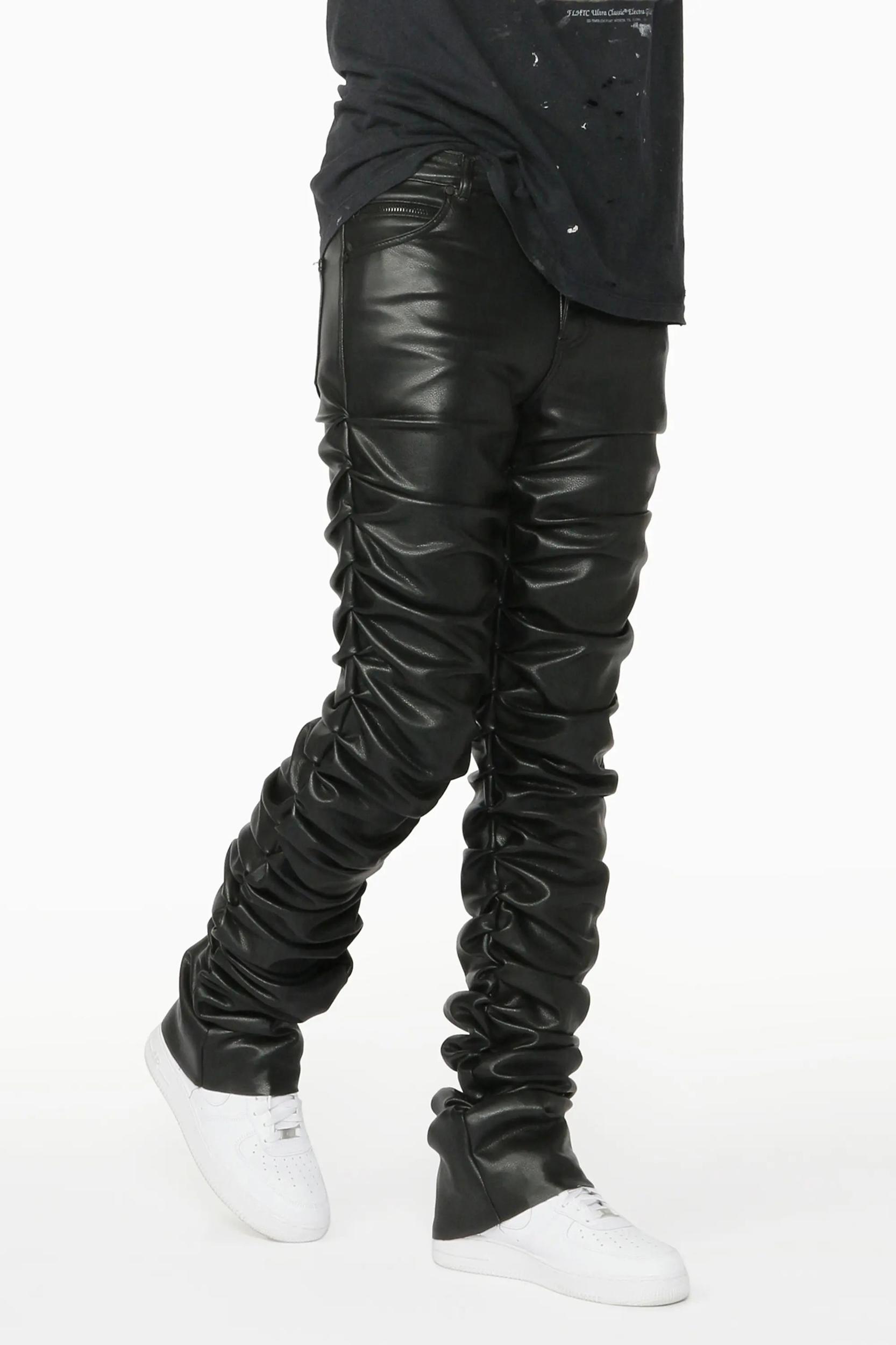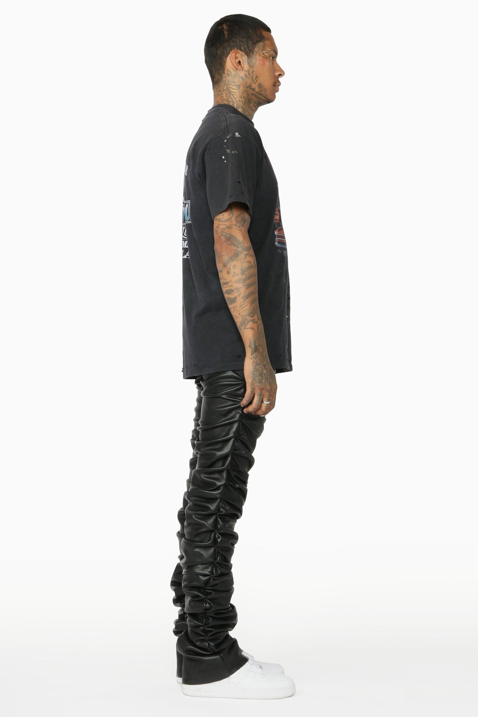 An elevated urban stacked flare jean for men in black. Designed with PU fabric and custom ruched detailing for a must-cop streetwear style. Zip fly with button closure 5-pocket build Faux leather fabric Ruched designing Stacked construction 35.75" seams *NOTE: These jeans are purposefully designed with extra long legs so the fabric properly bunches at the hem, creating the stacked flare style.