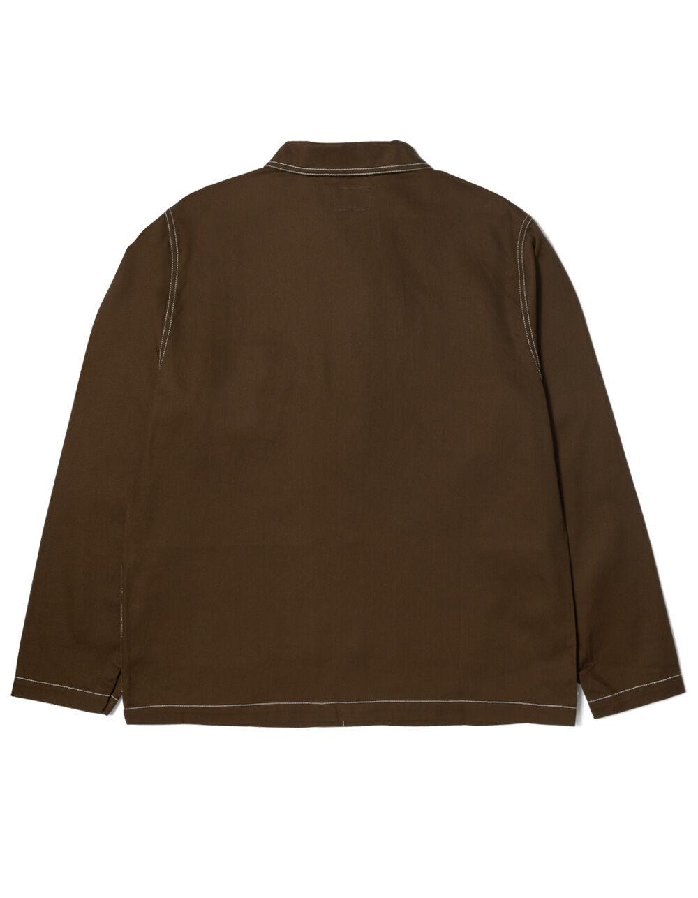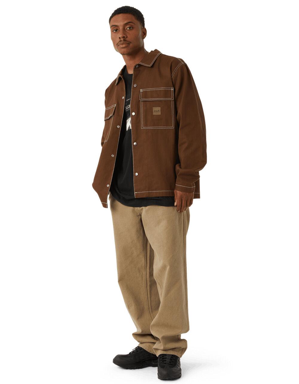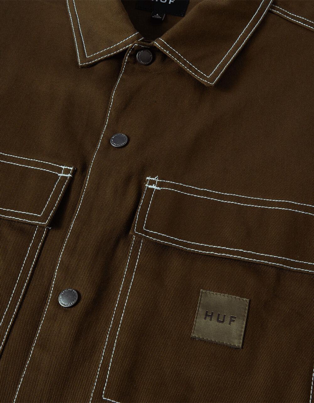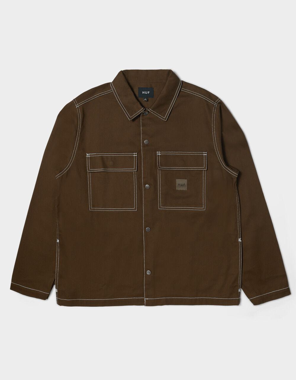 HUF Mason Shacket. Designed with HUF team rider Mason Silva, the Mason Shacket transforms French workwear with his personal touch. Built with a cotton twill construction, “M” stitched details, and photo labels by Mason, the Mason Shacket combines utility design with his signature aesthetics. Dual chest patch pockets with woven label. On seam hand pockets with embroidered "M" stitch detail. Metal snap front closure. Photo label on interior with photography by Mason Silva. Contrast stitching. 100% Cotton. Machine wash. Imported.