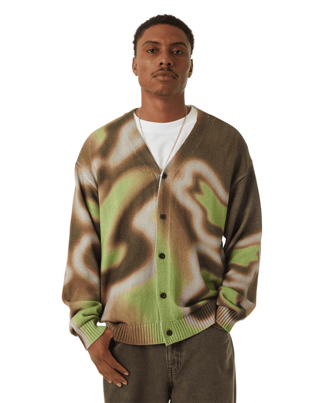 HUF Space Dust Cardigan. A 100% cotton knit cardigan with vintage lines and wavy all-over printed artwork, the Space Dust Cardigan features rib knit cuffs and hem and a full button-down front with engraved HUF buttons. HUF woven label at interior neck. V-neckline. 100% Cotton. Machine wash. Imported.
