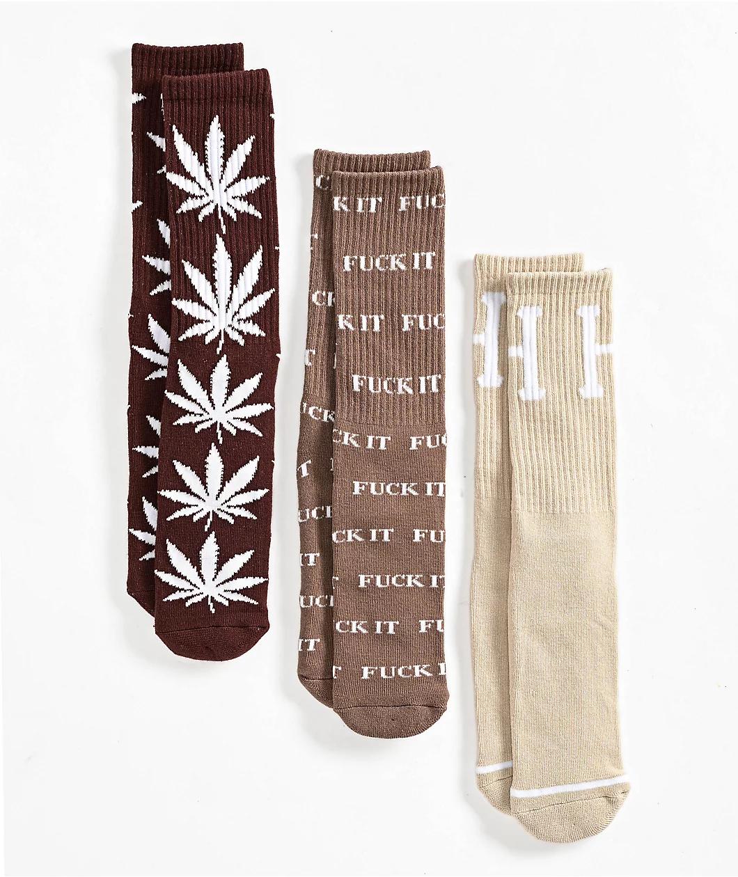 Single handedly making socks a fashion statement, HUF presents the Variety 3 pack of crew socks in natural earth tones and different designs to add some unique style to your sock drawer. Featuring one