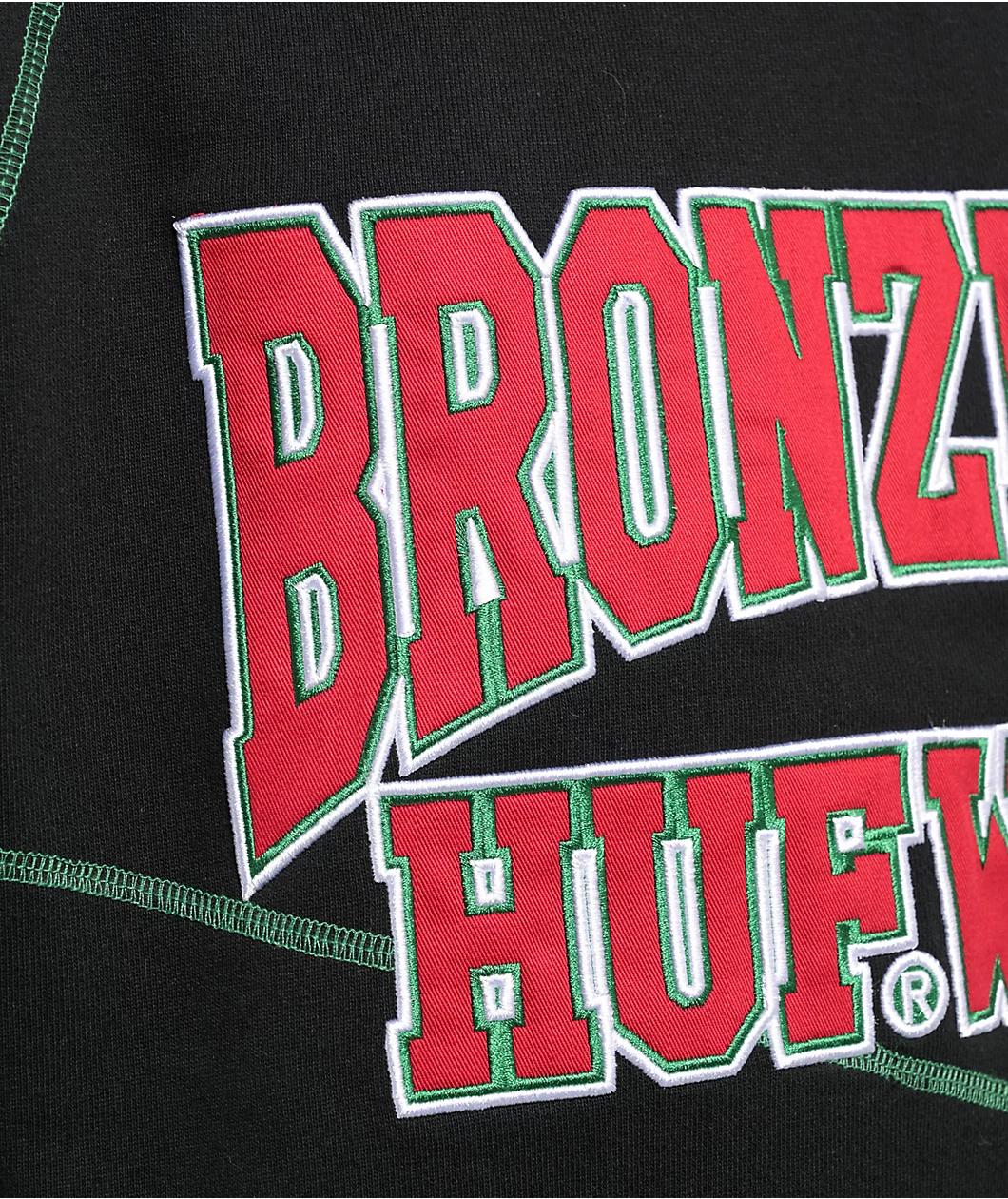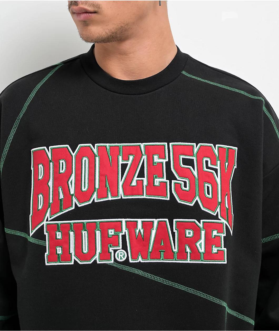 Available while supplies last, the limited edition HUF and Bronze 56K collaboration delivers the Hufware crewneck sweatshirt in a versatile black cotton build with embroidered branding and unique asymmetrical contrast stitching throughout for stylish