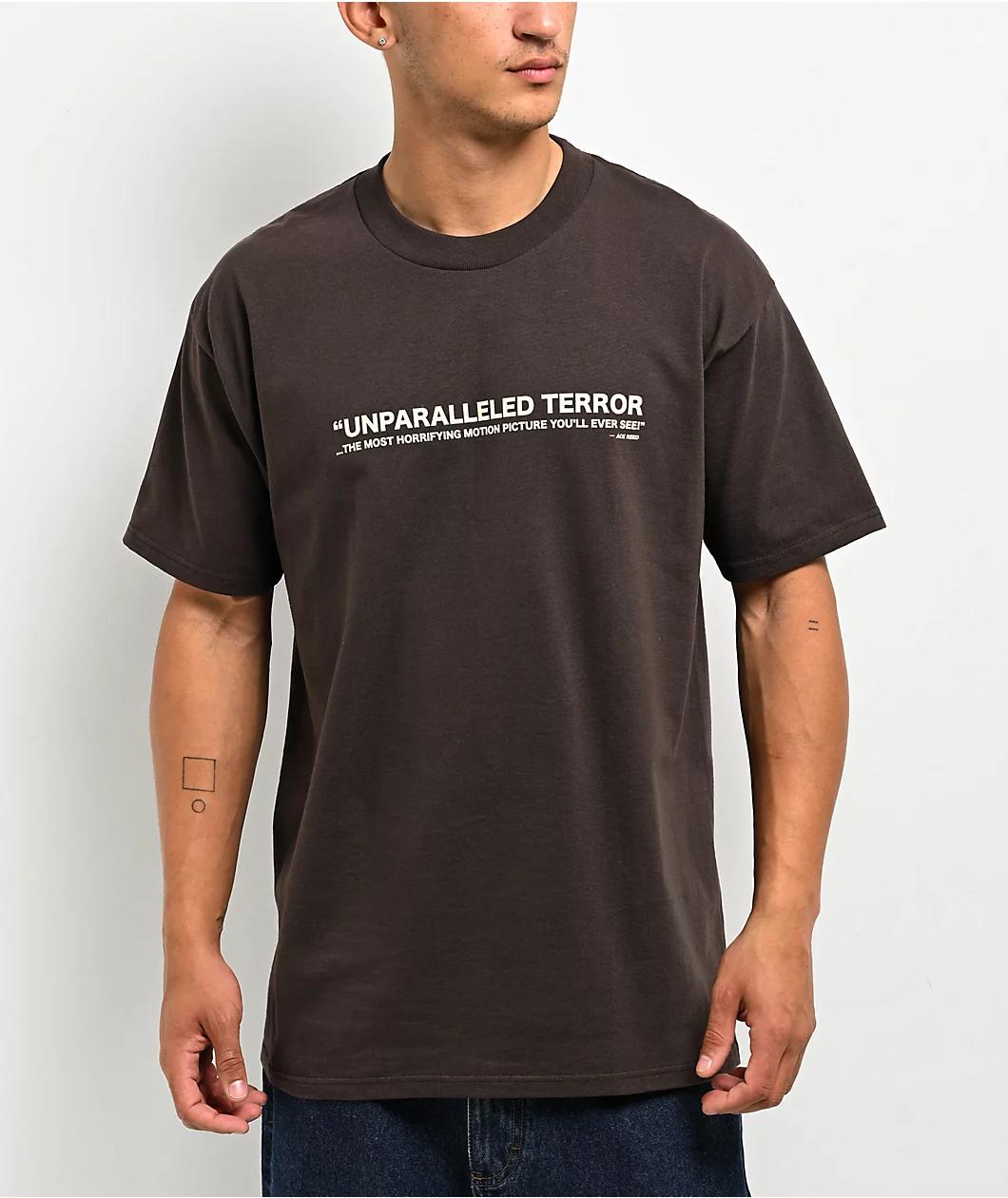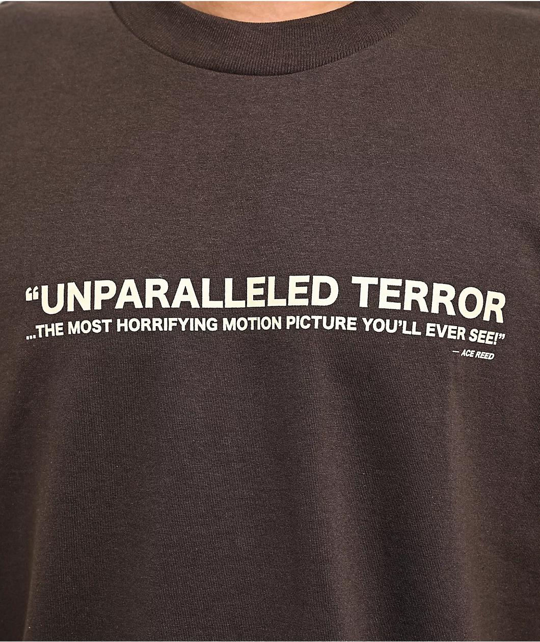 HUF collaborates with famous movie The Texas Chainsaw Massacre to present the Unparalleled Terror brown t-shirt. Off-white text across the chest taken from a review of the film calls it "The most horrifying motion picture you'll ever see" for a spook