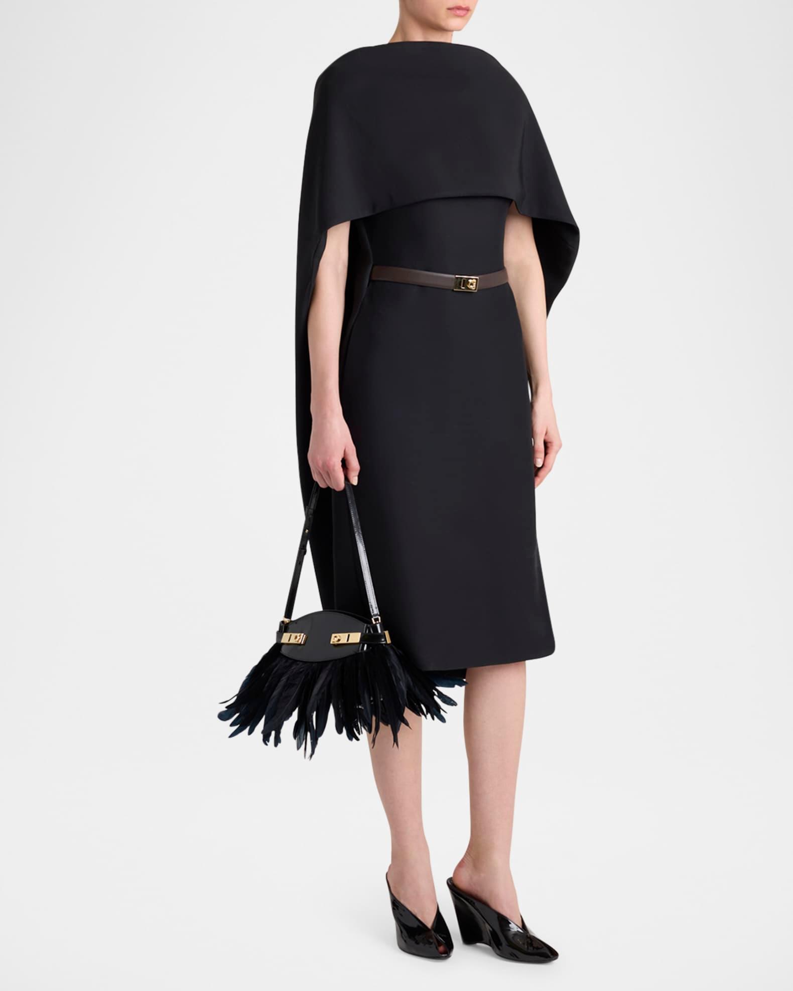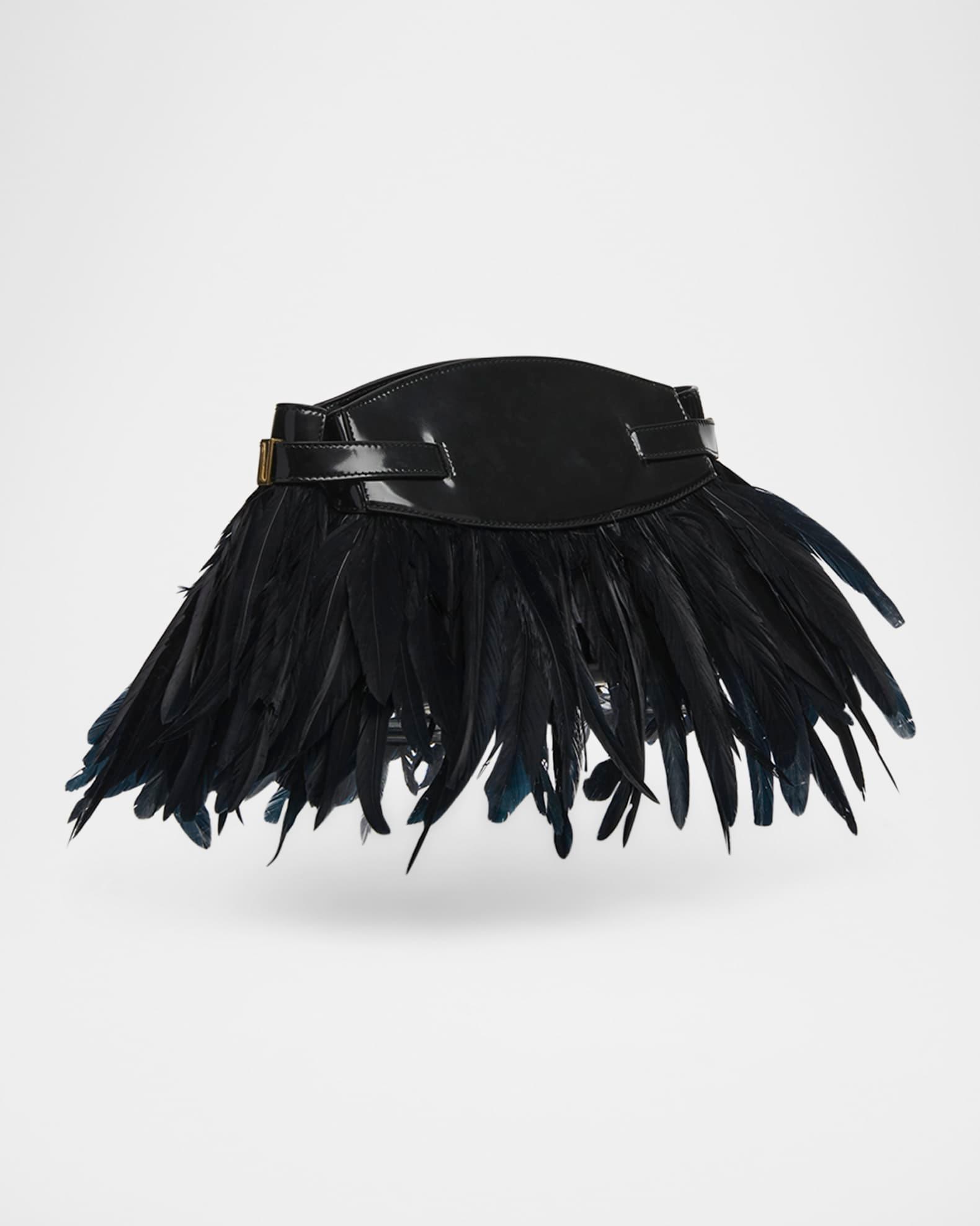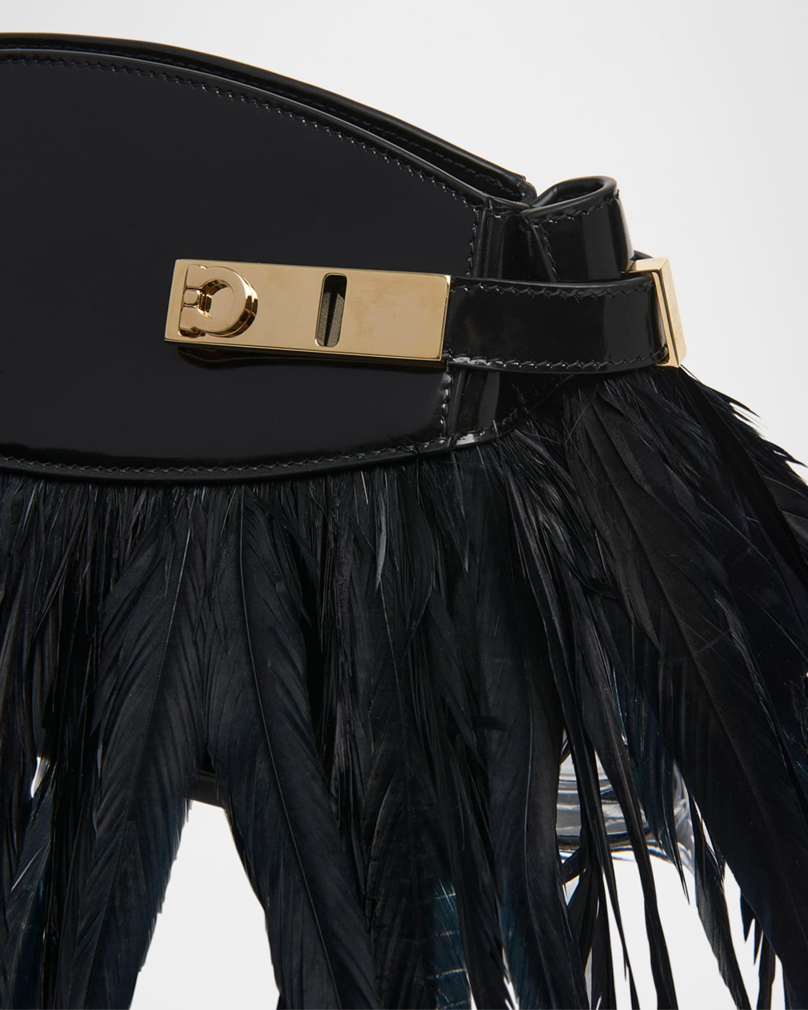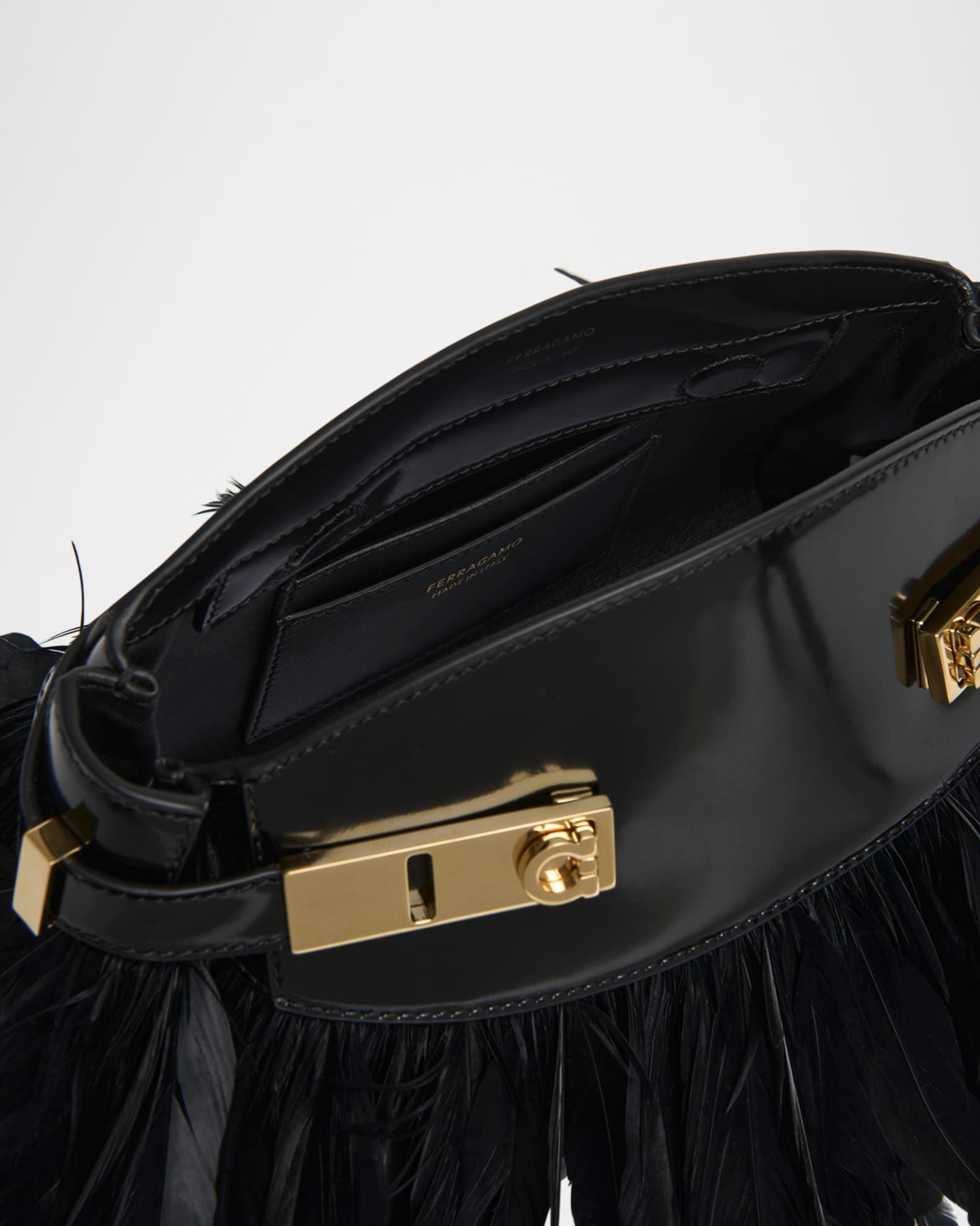 The slim "Hug" shoulder bag from Ferragamo is crafted in structured patent calfskin leather and flutters with ostrich feathers (South Africa) Detachable, adjustable shoulder strap Structured top with magnetic closure Side straps with gold-tone Gancini buckles Interior, two slip pockets Approx. 5.9"H x 9.5"W x 4.7"D Made in Italy