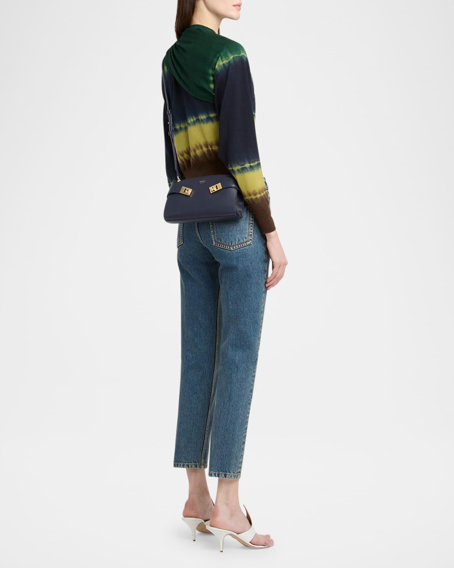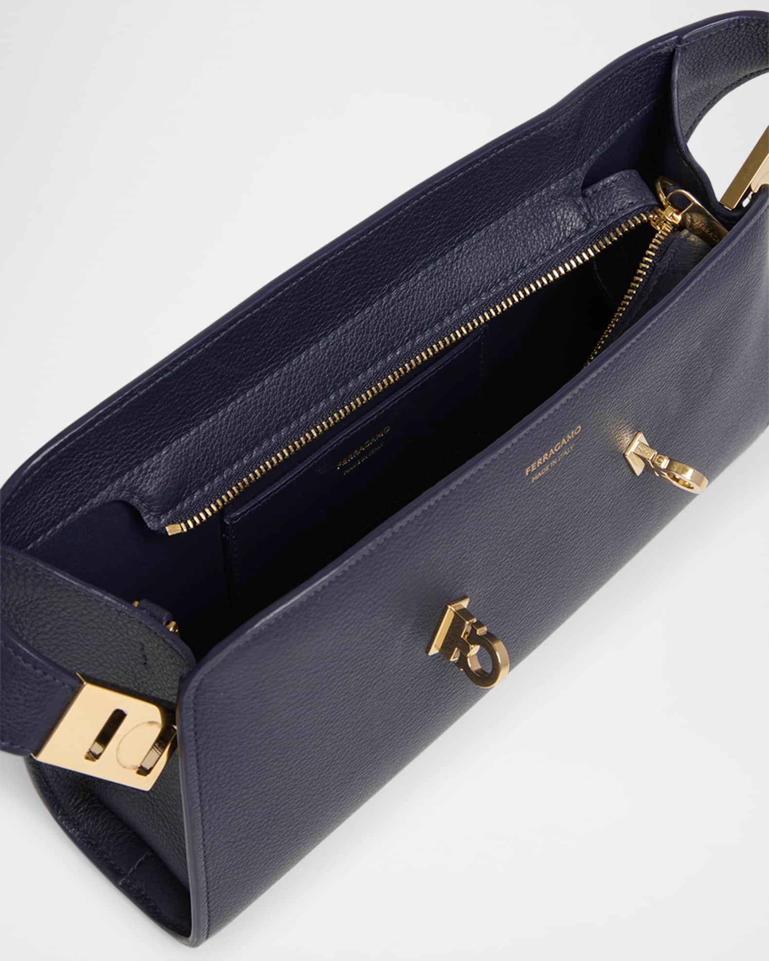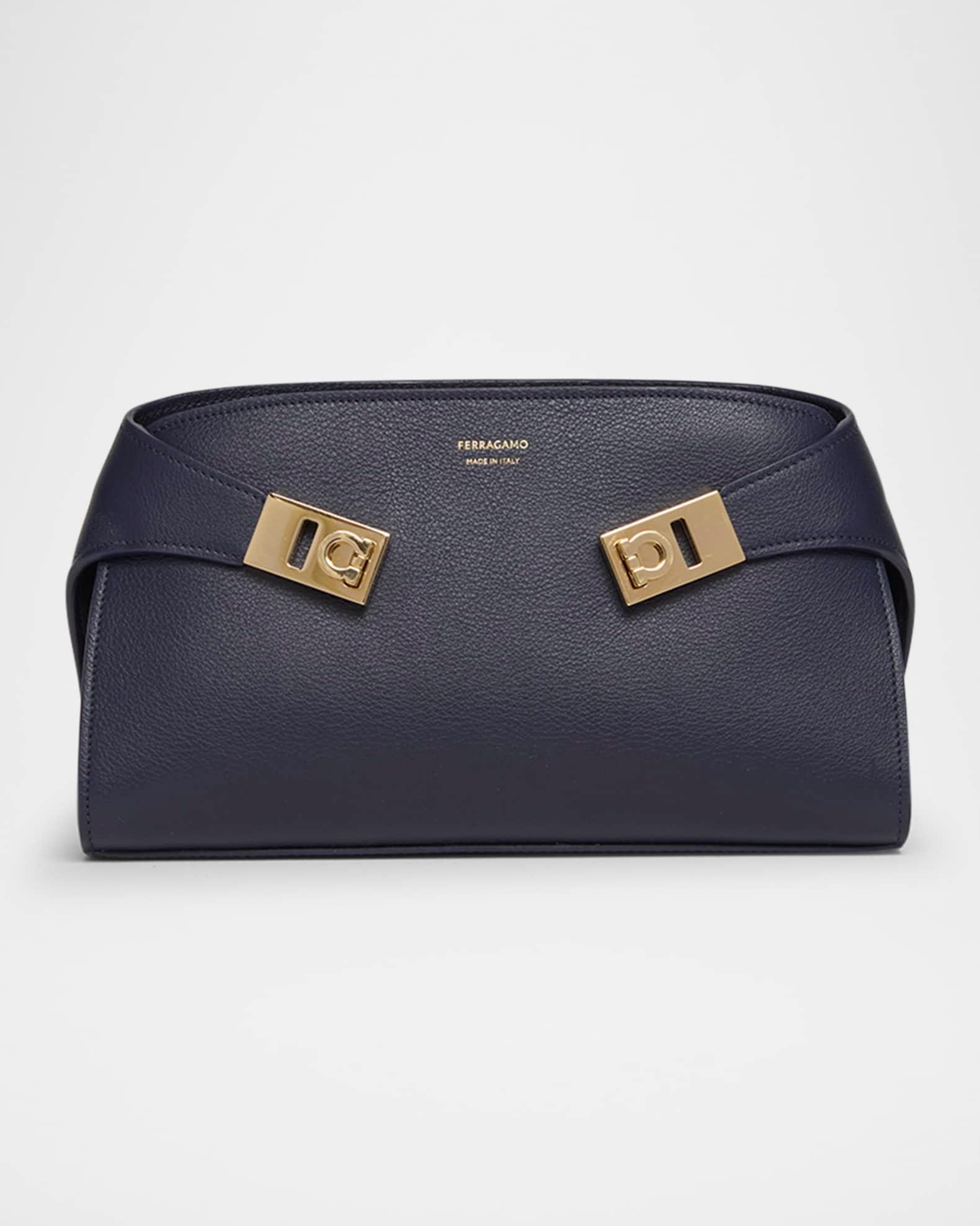 Ferragamo "Hug" crossbody bag in soft leather Detachable, adjustable crossbody strap Can be worn as a clutch, shoulder, or crossbody bag Zip top closure Adjustable Gancini lift clasp closures on sides Interior, two card slots Approx. 5.5"H x 9.4"W x 2.2"D Professional cleaning recommended, spot clean Made in Italy