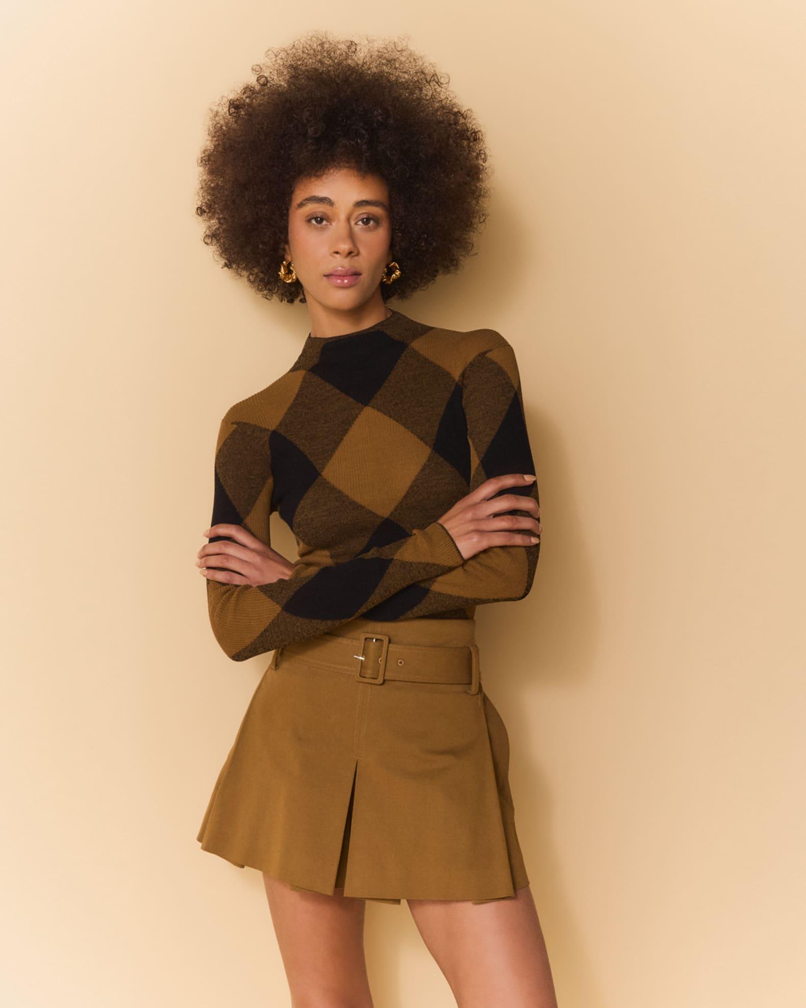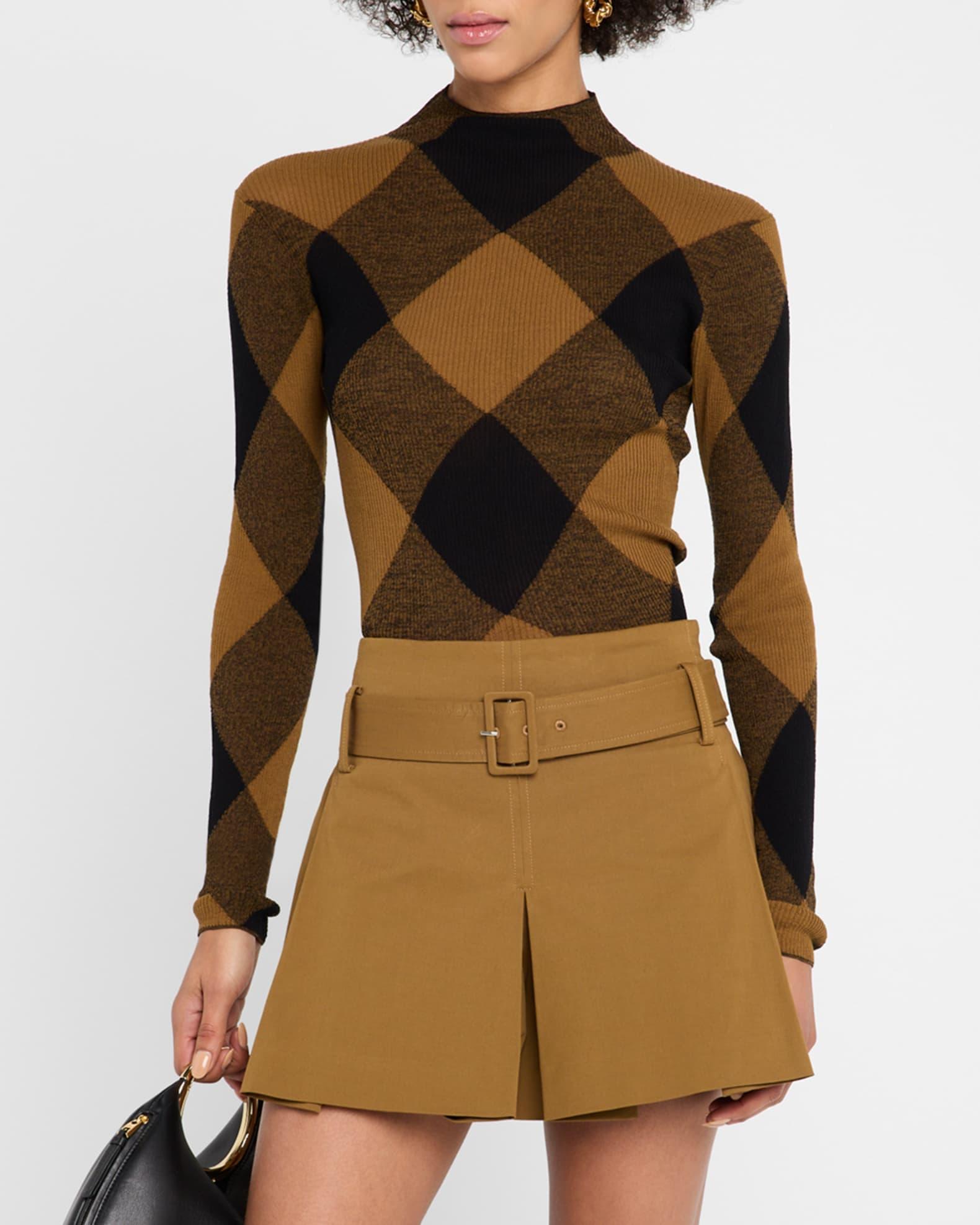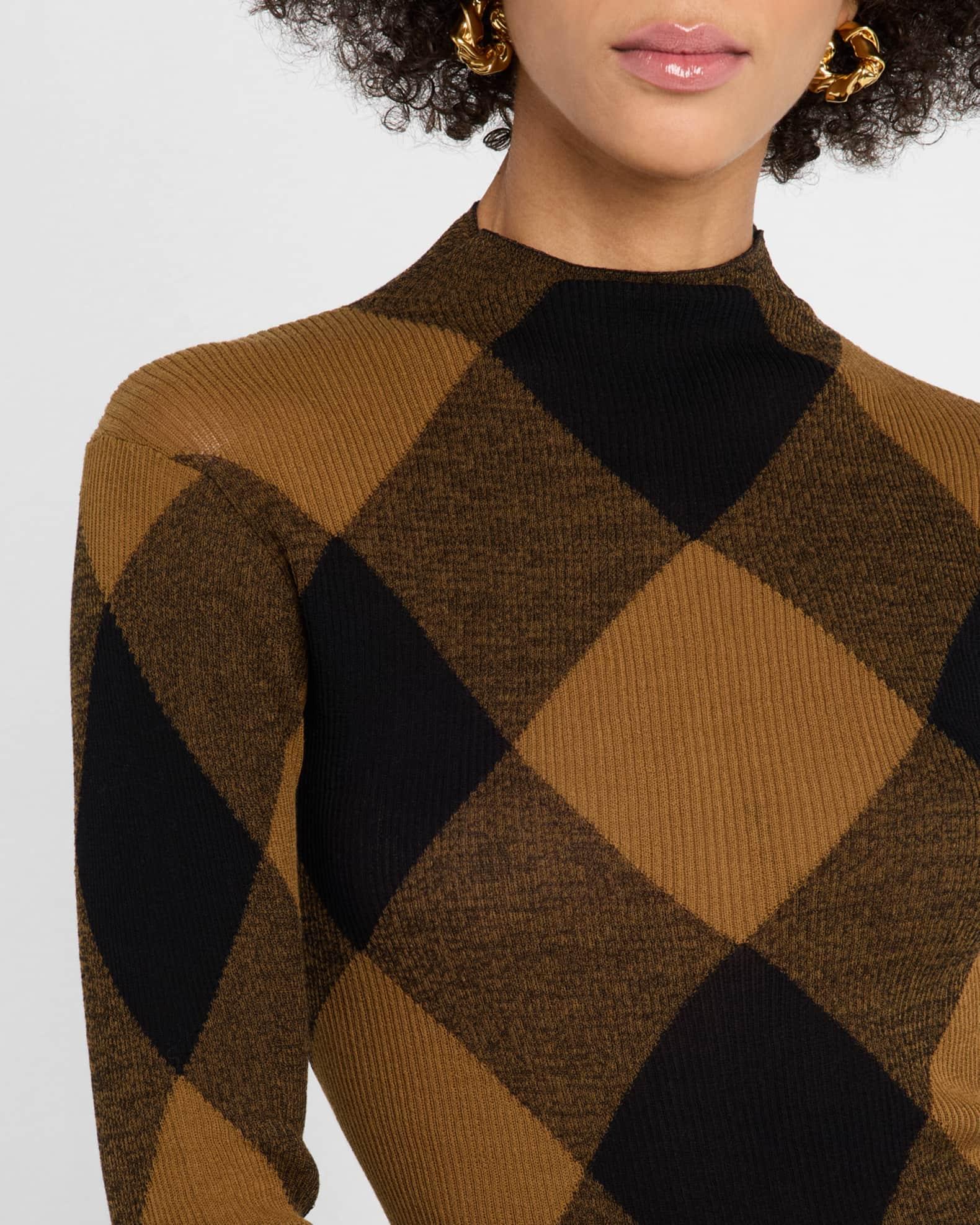A.L.C. "Hugh" knit wide-check top Mock neckline Long sleeves Fitted Hem sits at the hip Pullover style Cotton/nylon/polyamide Unlined Dry clean Imported